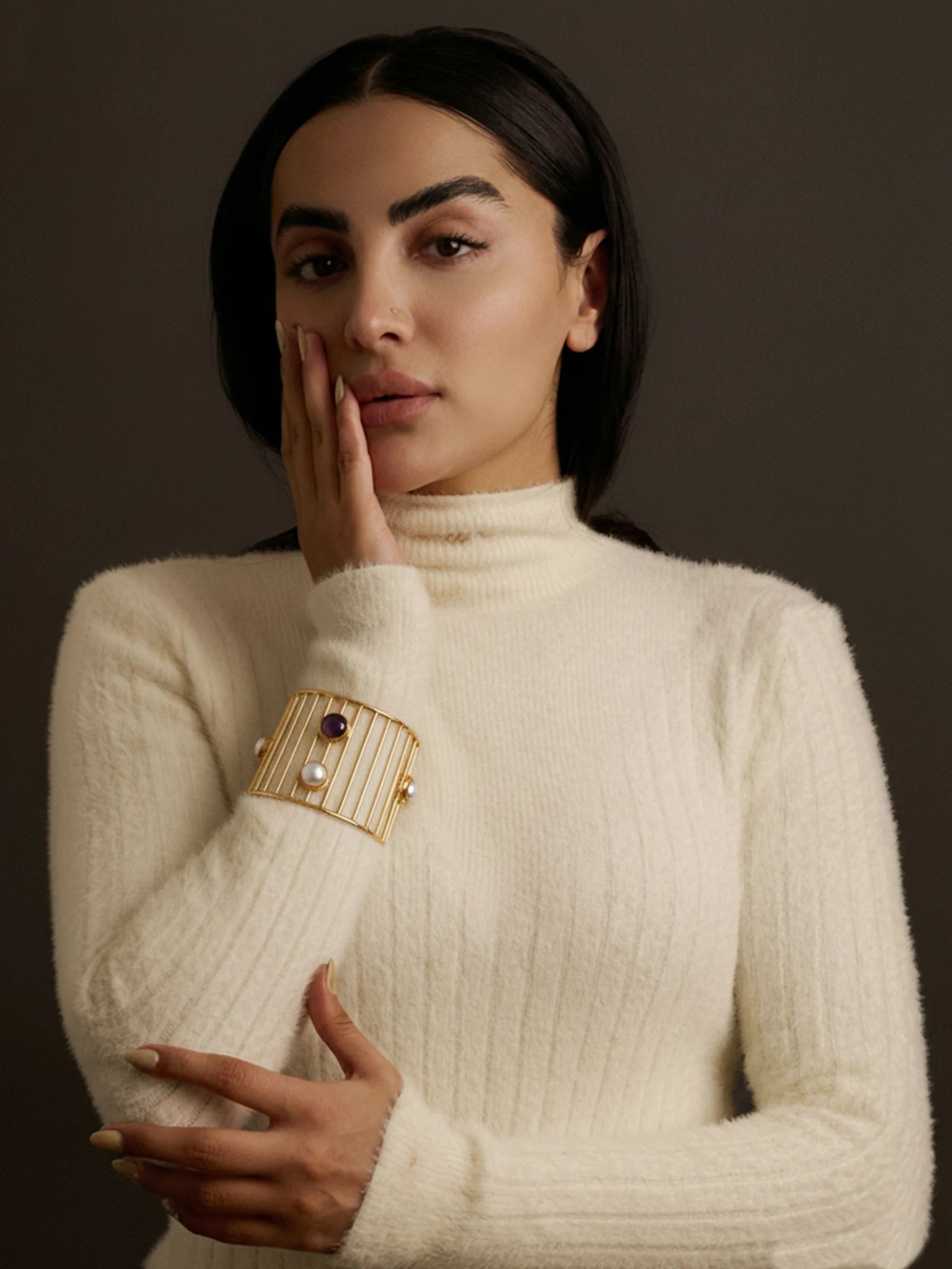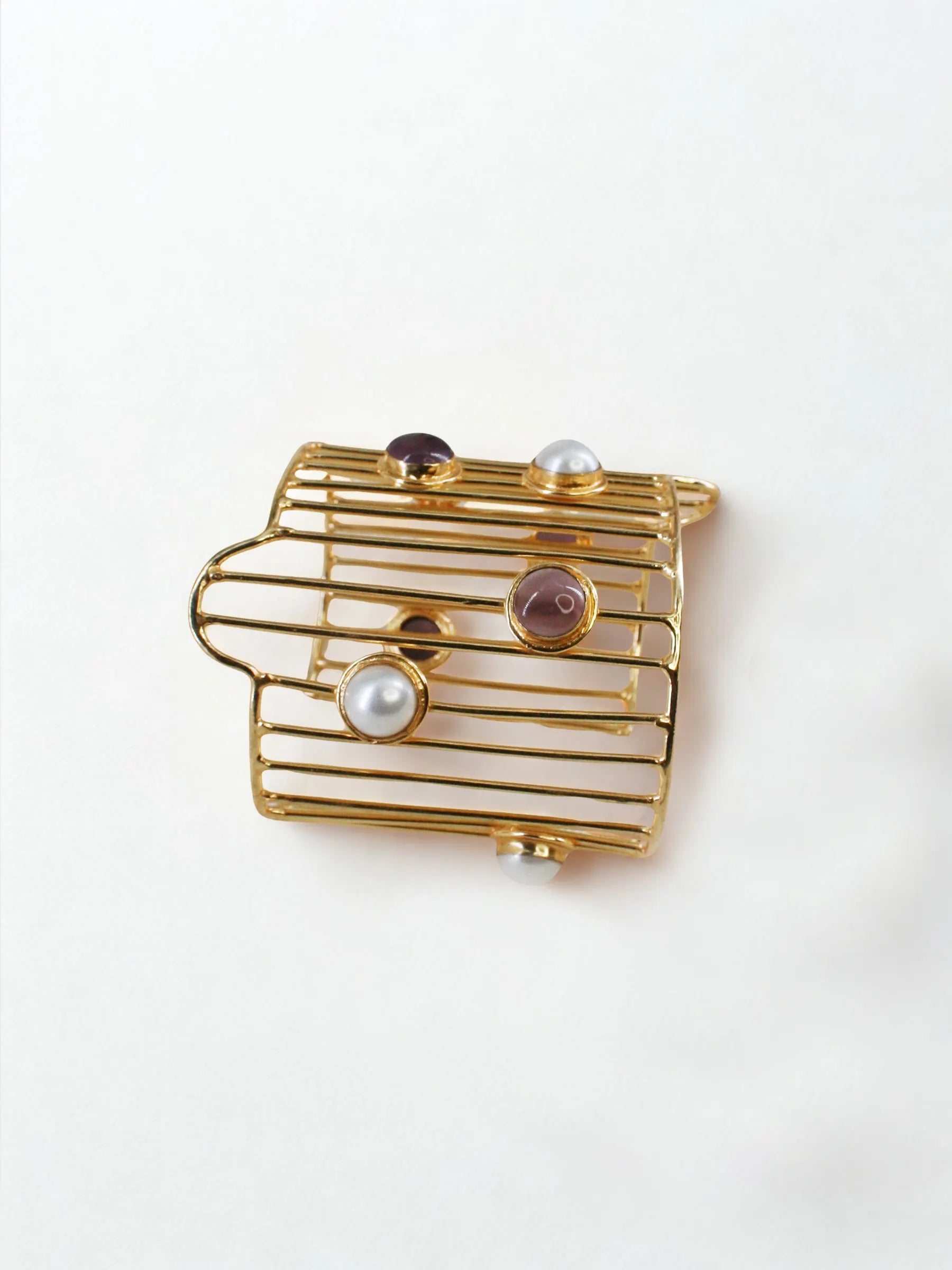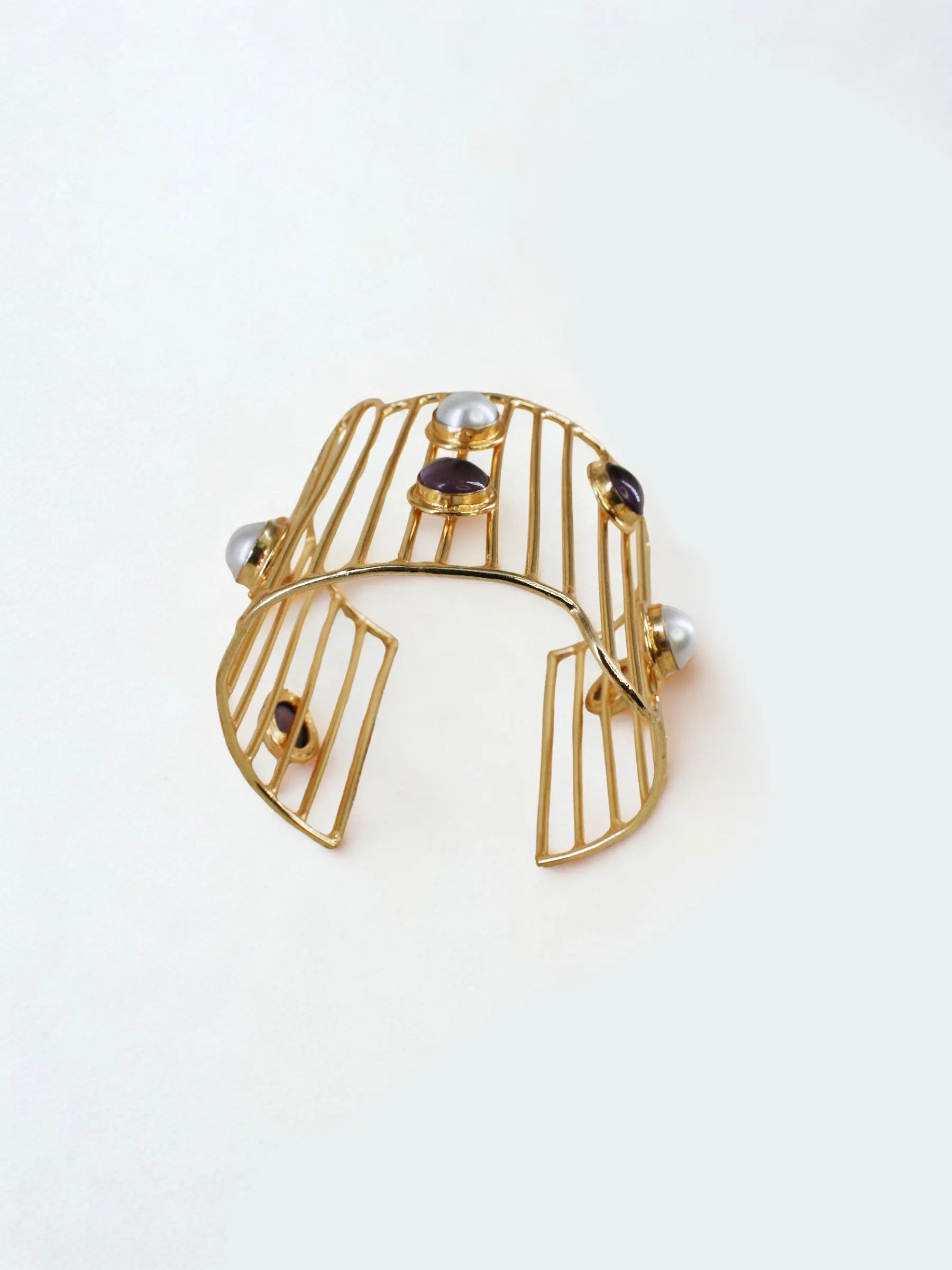Handcrafted in recycled brass and finished in radiant 18K gold plating, the Nova Grid Handcuff features a vertical line framework punctuated with abstract placements of amethyst and pearls. Scattered like a stardust constellation, each stone brings a sense of cosmic rhythm and refined asymmetry. A sculptural modern heirloom that captures the quiet poetry of a galaxy in motion.