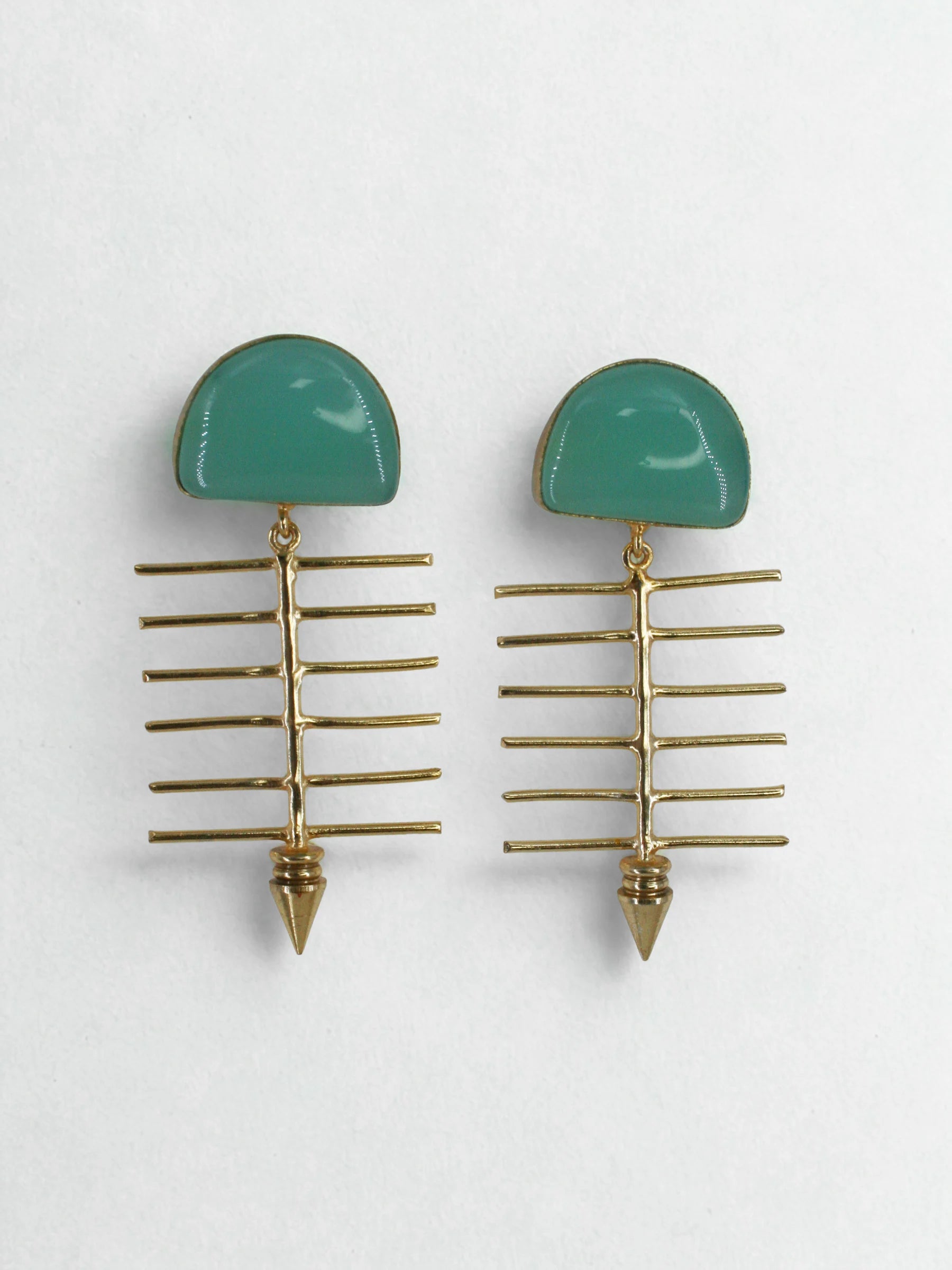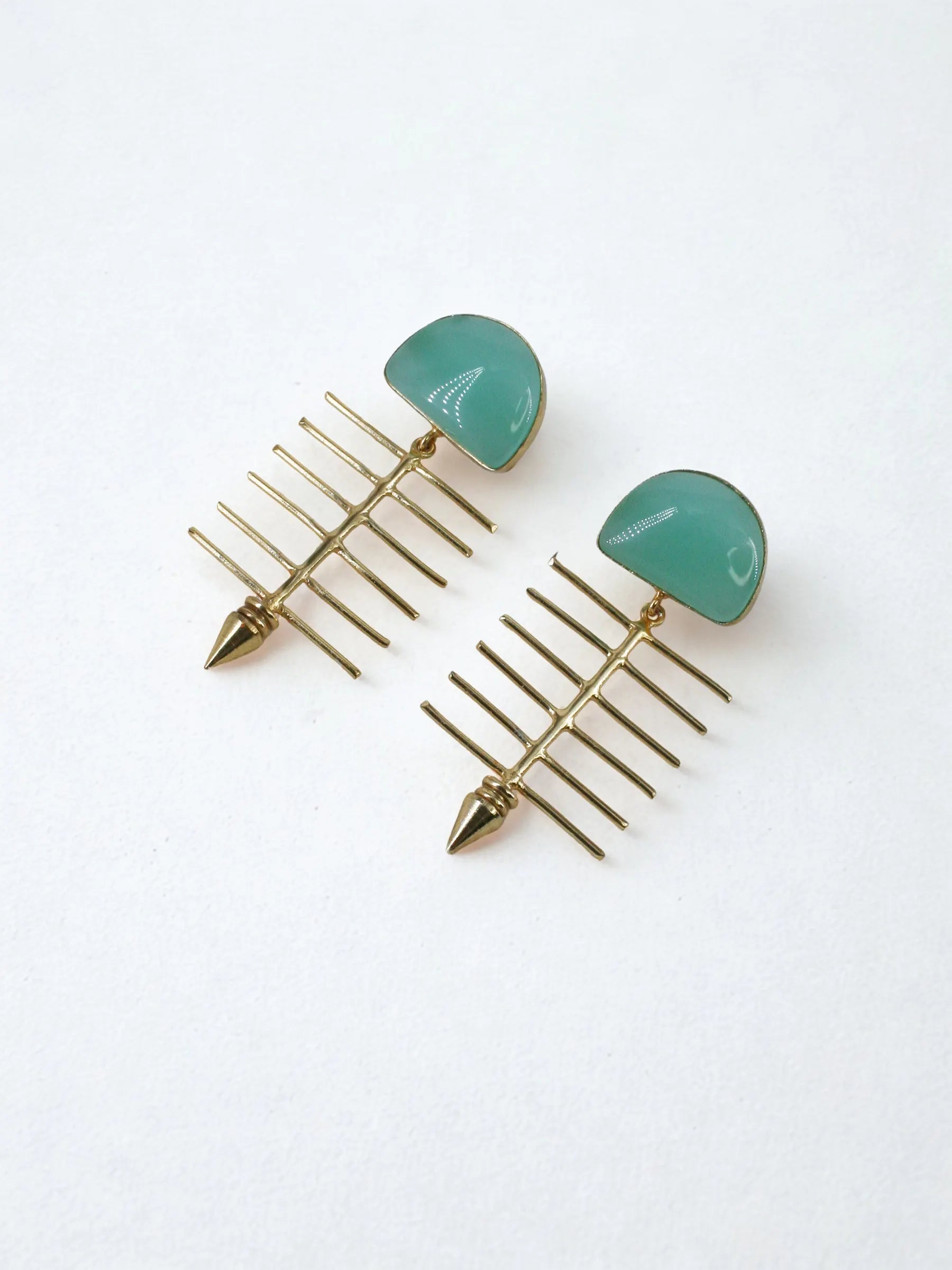 Handcrafted in recycled brass and finished with radiant 18K gold plating, the Oh Fish Earrings reinterpret a fish-skeleton silhouette through a sleek, contemporary lens. Raw stones and sculptural metal lines create an edgy, expressive form that feels playful yet artfully refined. A bold modern heirloom — unexpected, dynamic, and crafted with unmistakable character.