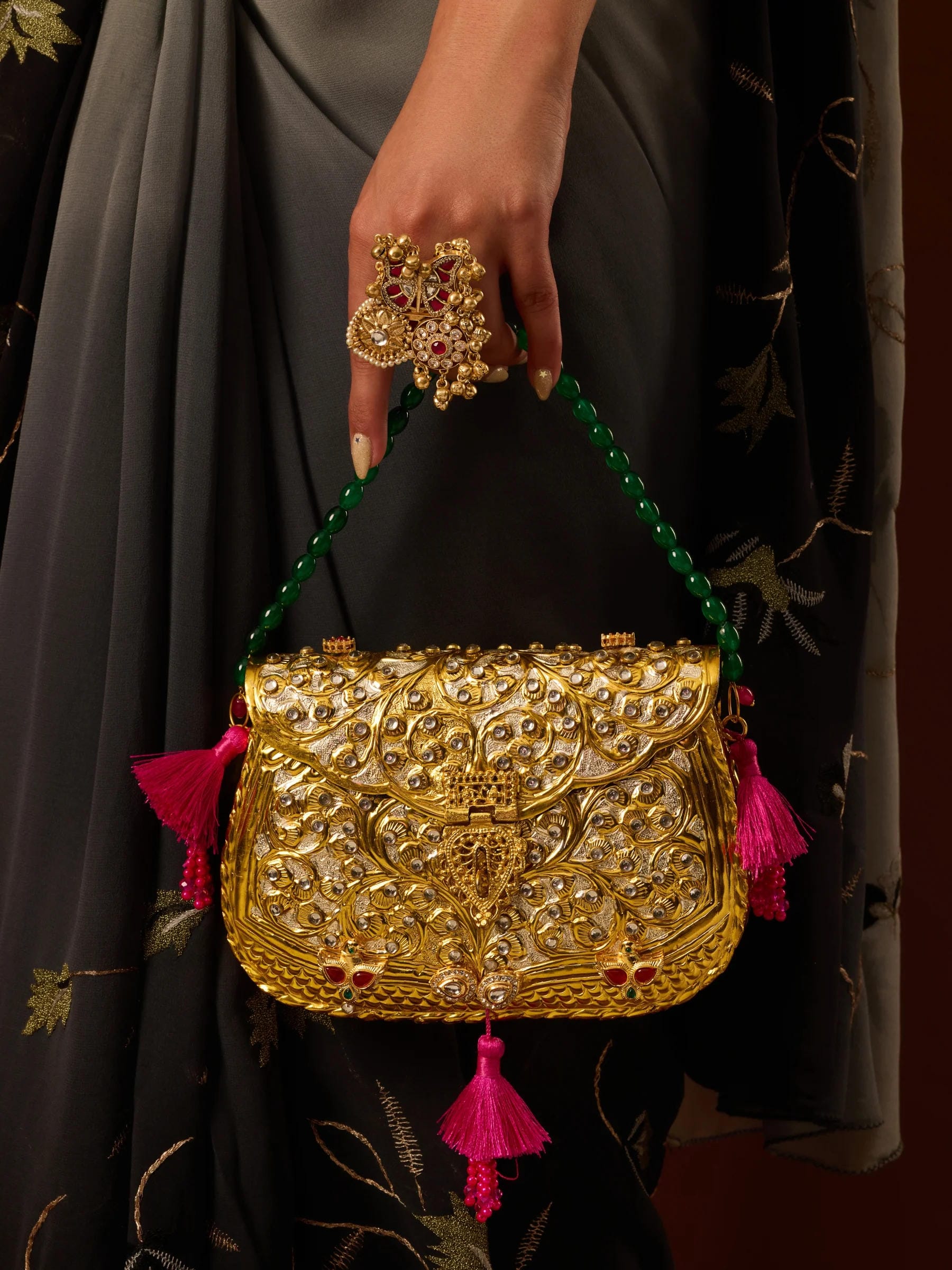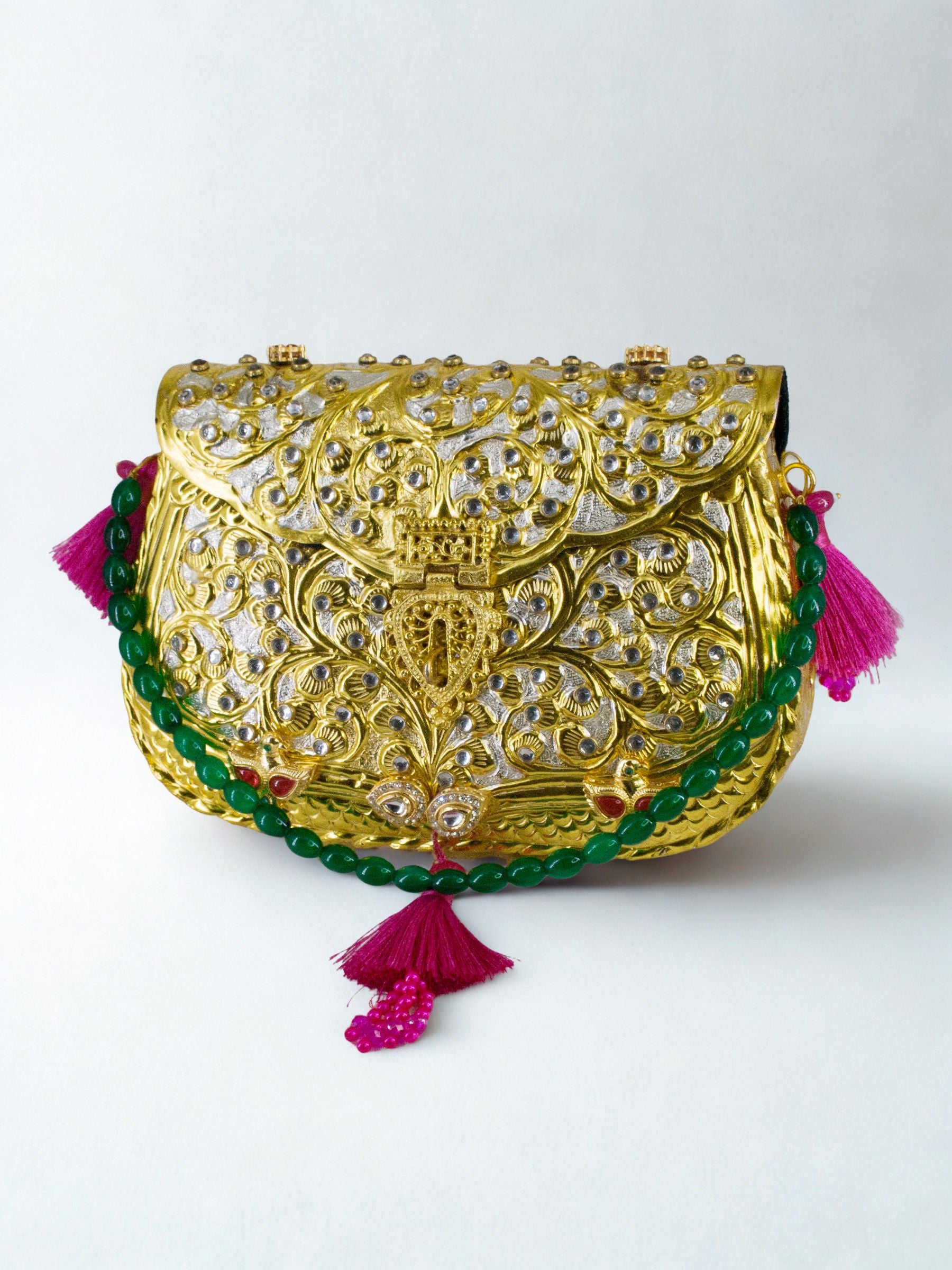 A regal statement of Indian artistry, the Padmaja Clutch draws inspiration from the ornate nakashi and repoussé work of royal jewels. Its sculpted gold and silver-plated surface shimmers with hand-set silver stones, echoing the grandeur of palace treasures. Twin peacocks in ruby and emerald perch atop the design, adding a touch of living ornamentation. Finished with rani pink tassels and a carved emerald stone handle, Padmaja bridges heritage and modern glamour — a jewel of a clutch made for the modern-day maharani.
