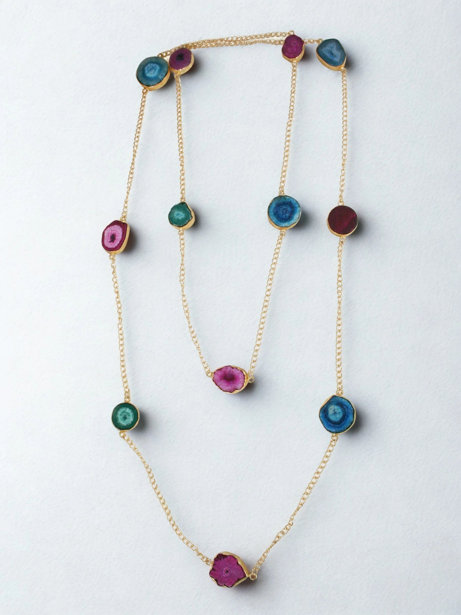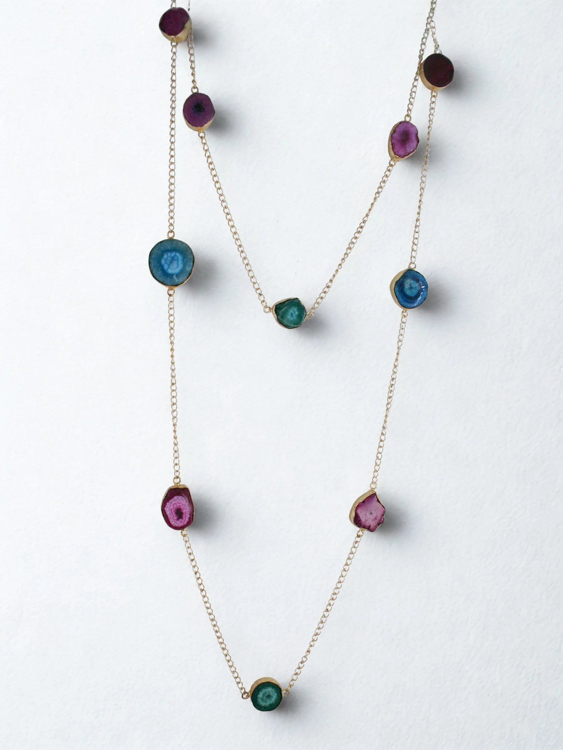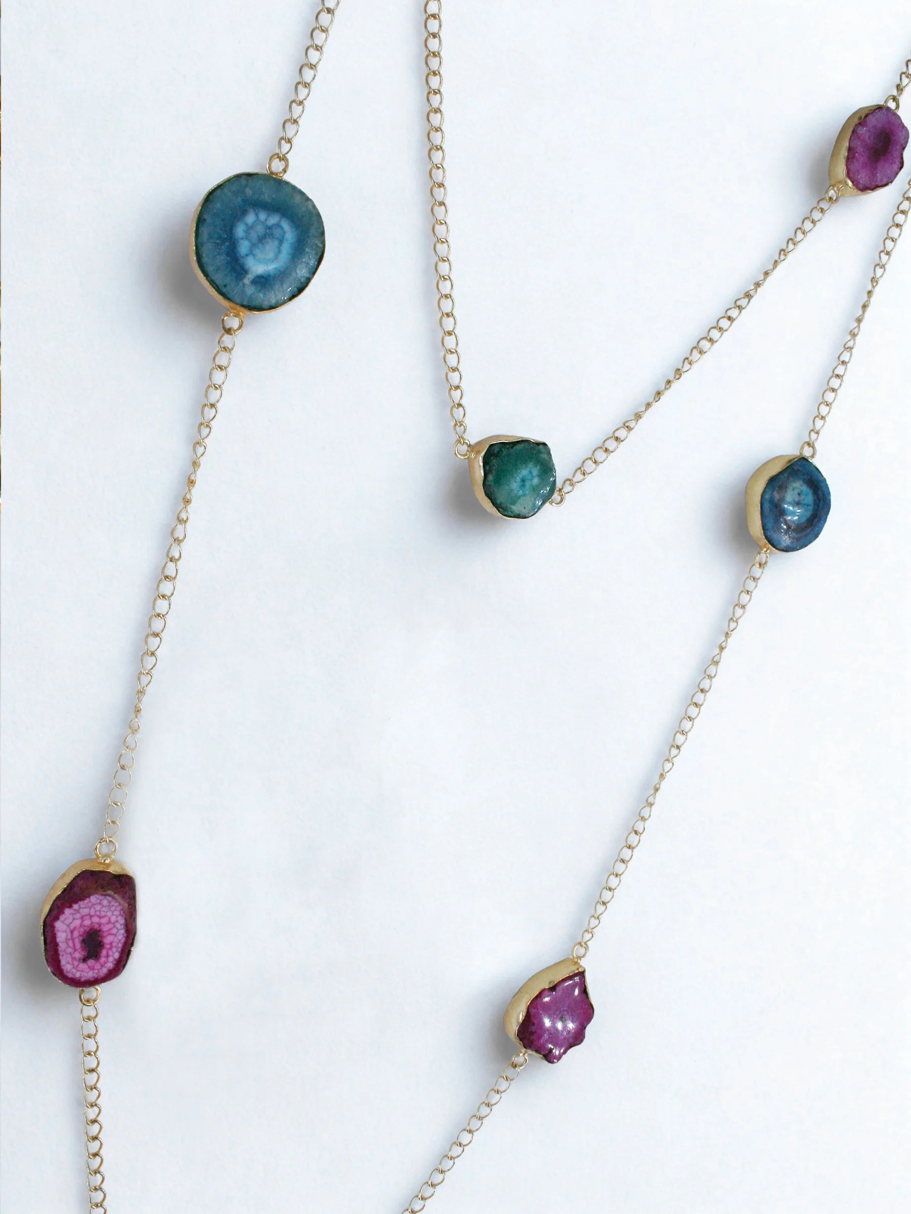 Handcrafted in recycled brass and finished with luminous 18K gold plating, the Planetorium Long Body Chain features a sleek golden chain accented with mixed agate stones framed in gilded edges. Designed for versatility, it can be worn as a cross-body sling or doubled into a two-tier necklace, creating a fluid constellation of color and light. A celestial modern heirloom — elegant, transformative, and crafted with artisanal precision.