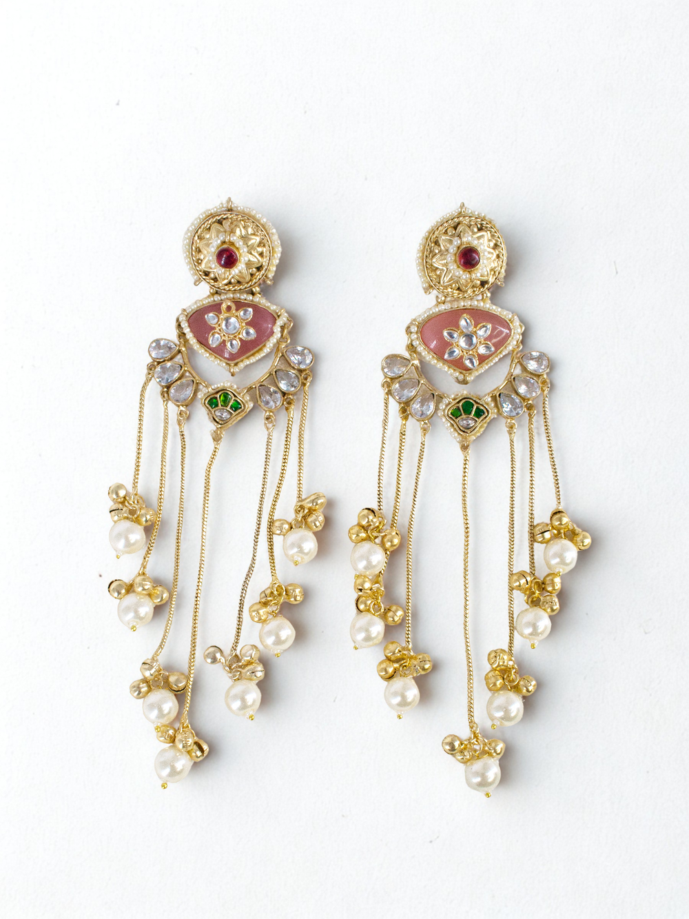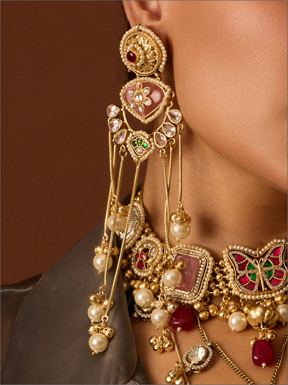 Rooted in the elegance of classic kundan artistry, these earrings feature luminous kundan elements paired with long, fluid chain hangings that sway with graceful movement. Handcrafted in recycled metal and finished with 18K gold plating, they blend regal tradition with contemporary refinement. Sculptural, luminous, and delicately dramatic — a modern heirloom for those who love timeless craft with a touch of effortless glamour.