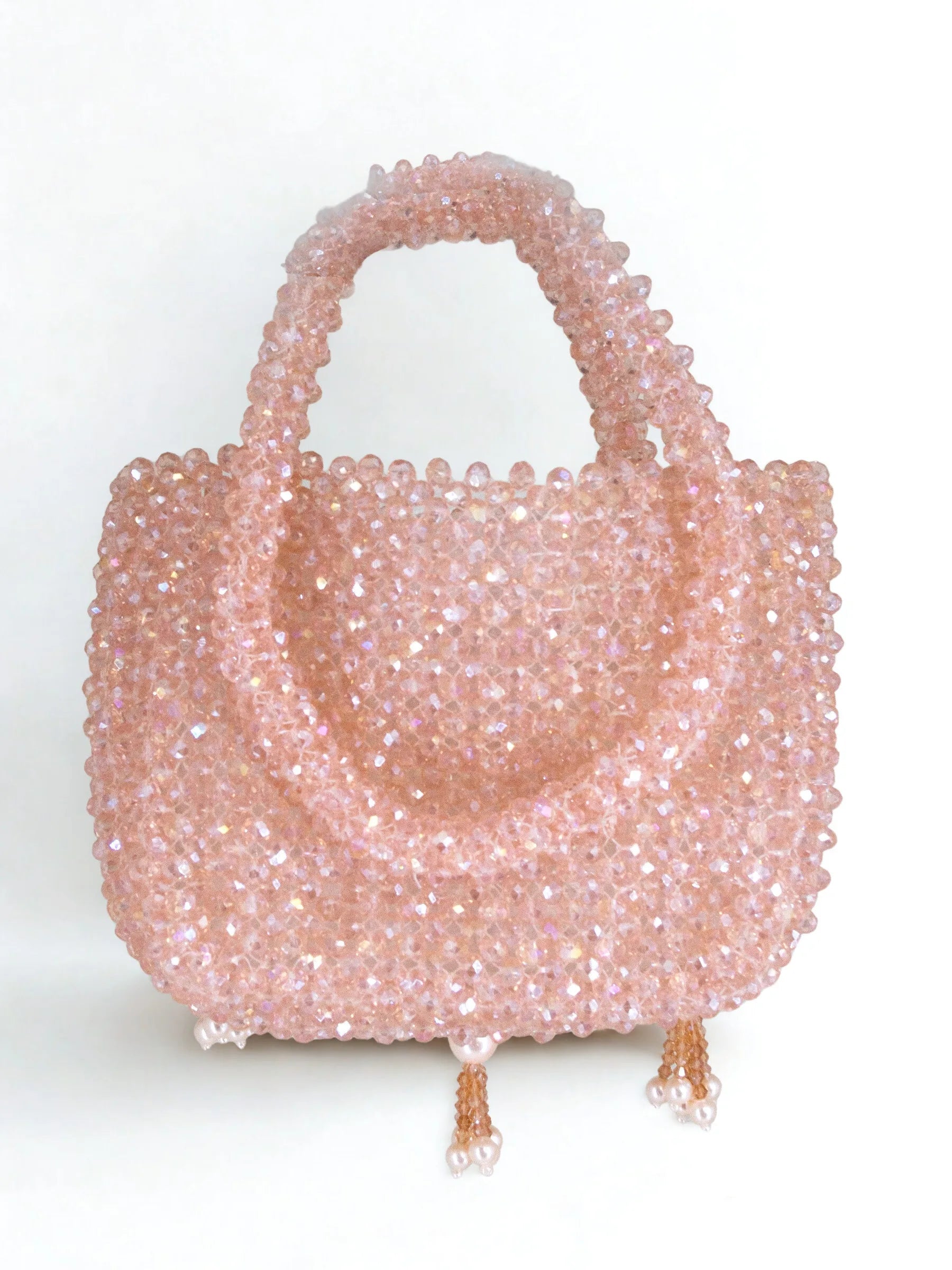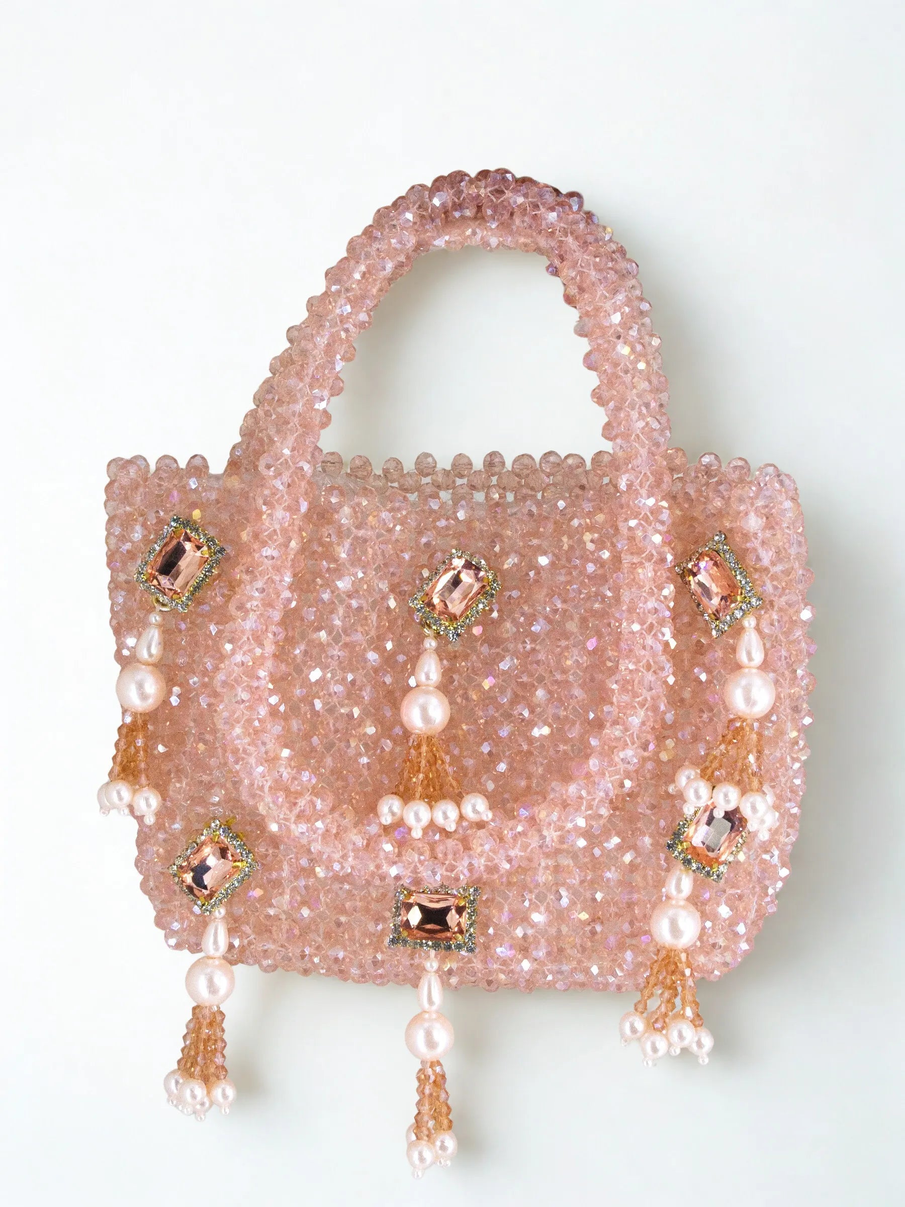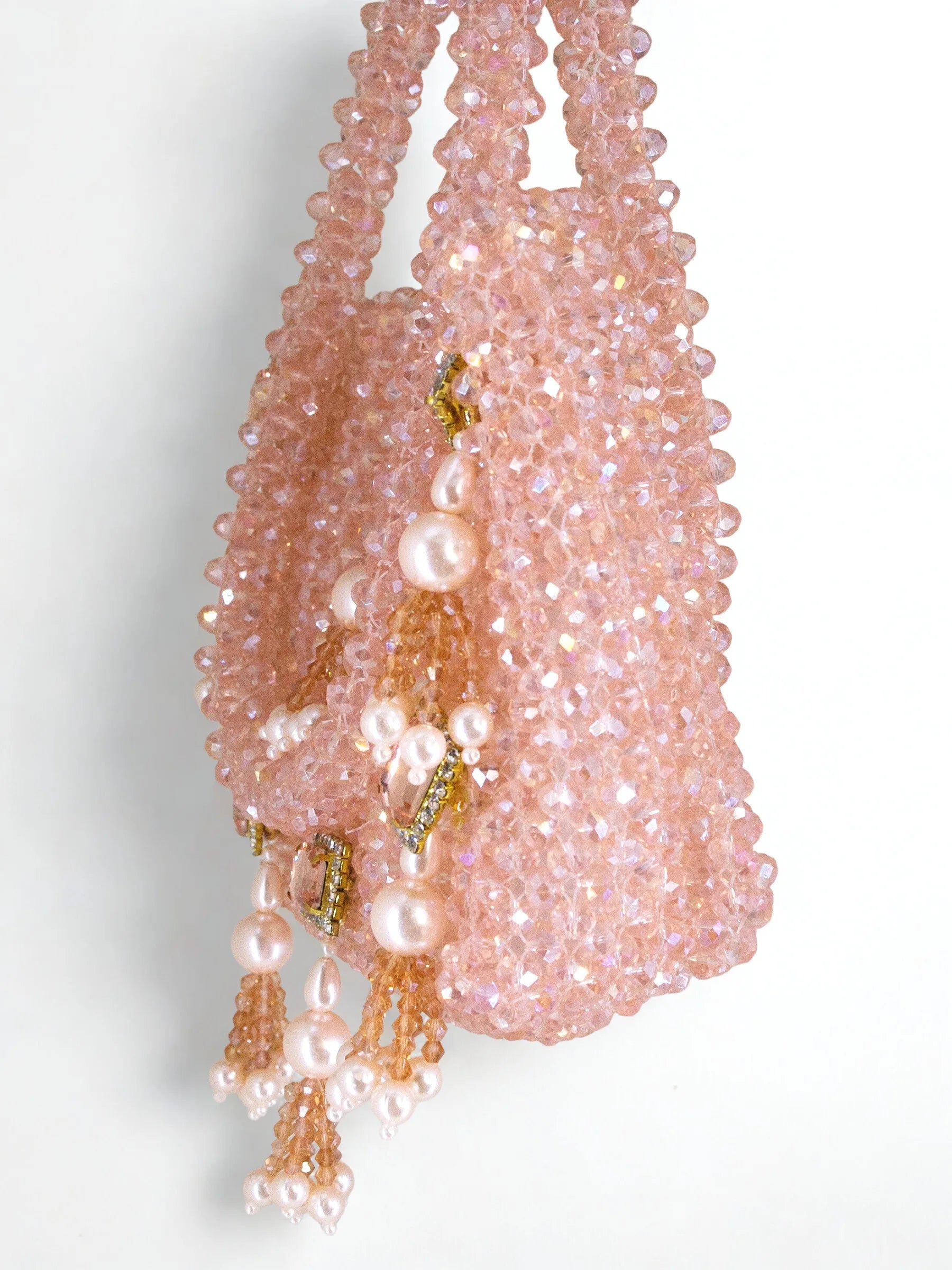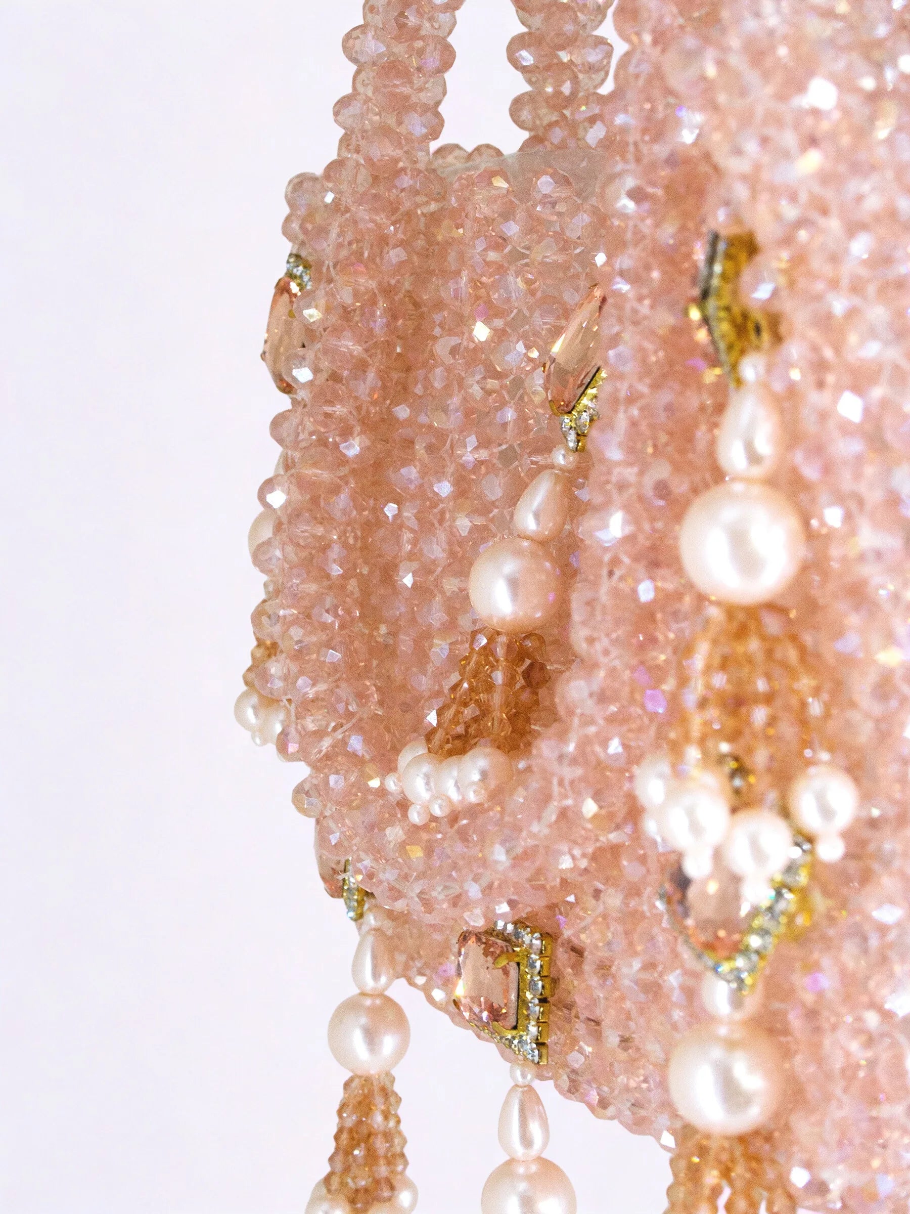 This bucket bag shimmers with pink diamond-inspired crystals and cascading pearl bead tassels. Designed to move and catch light, it blends playful glamour with artisanal depth.