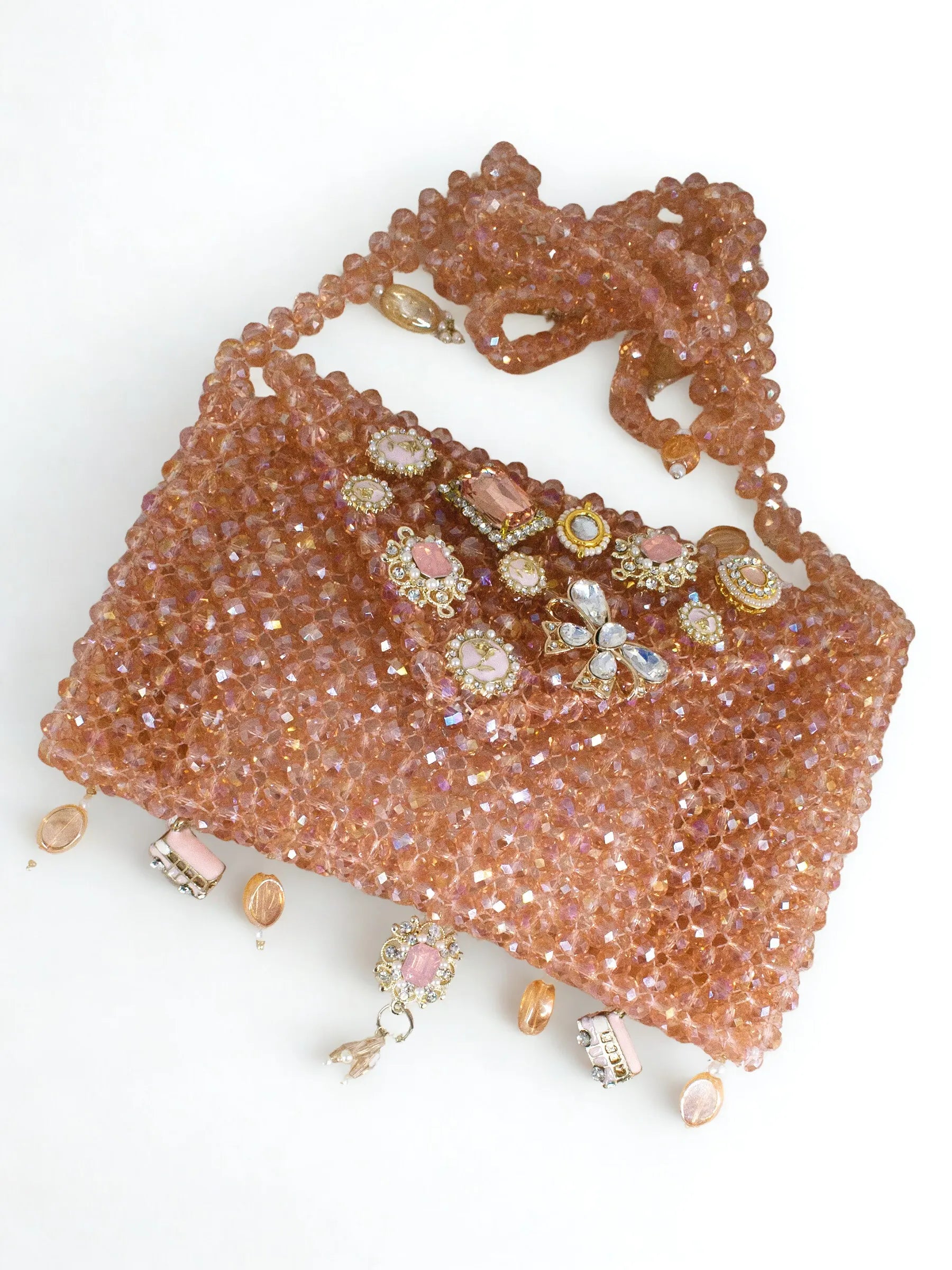 Minimal in form yet luminous in surface, this sleek sling is crafted in rose-pink beads with subtle jewel embellishment on the flap. A refined expression of modern femininity with a soft, glowing edge.