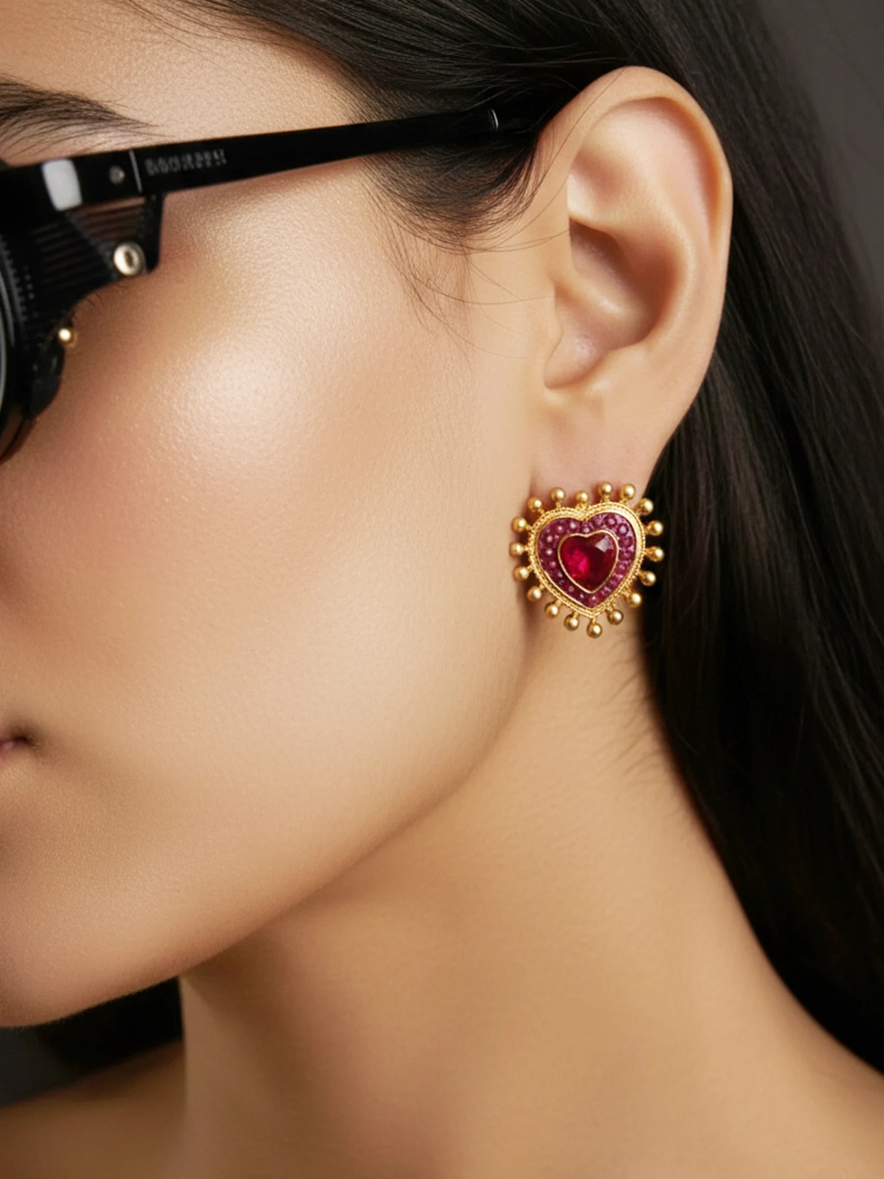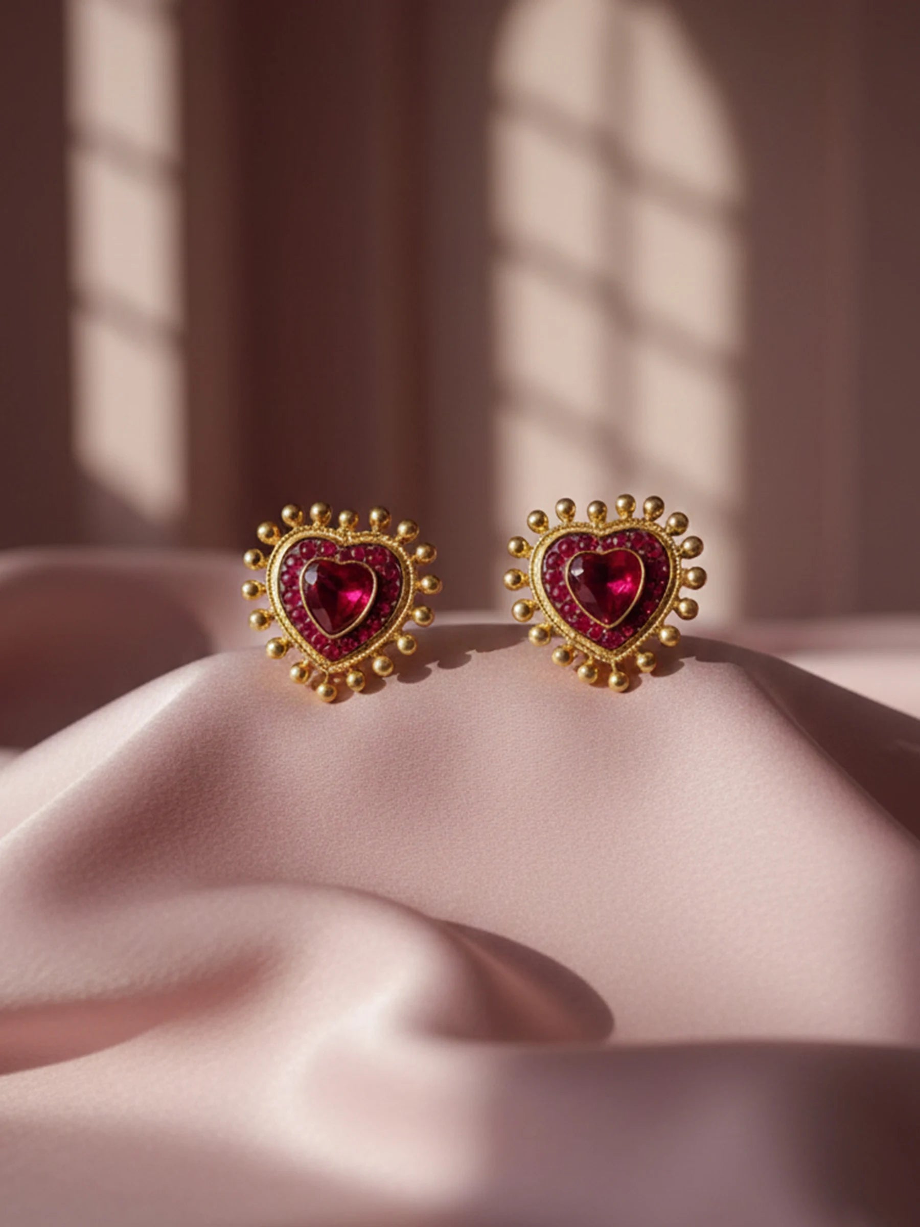Rendered in deep vintage red, these heart studs are anchored by a luminous crystal centre, framed with delicate ball spikes that radiate outward like a protective halo. Equal parts romance and strength, they evoke a timeless intensity—where love is vivid, guarded, and worn with confidence.