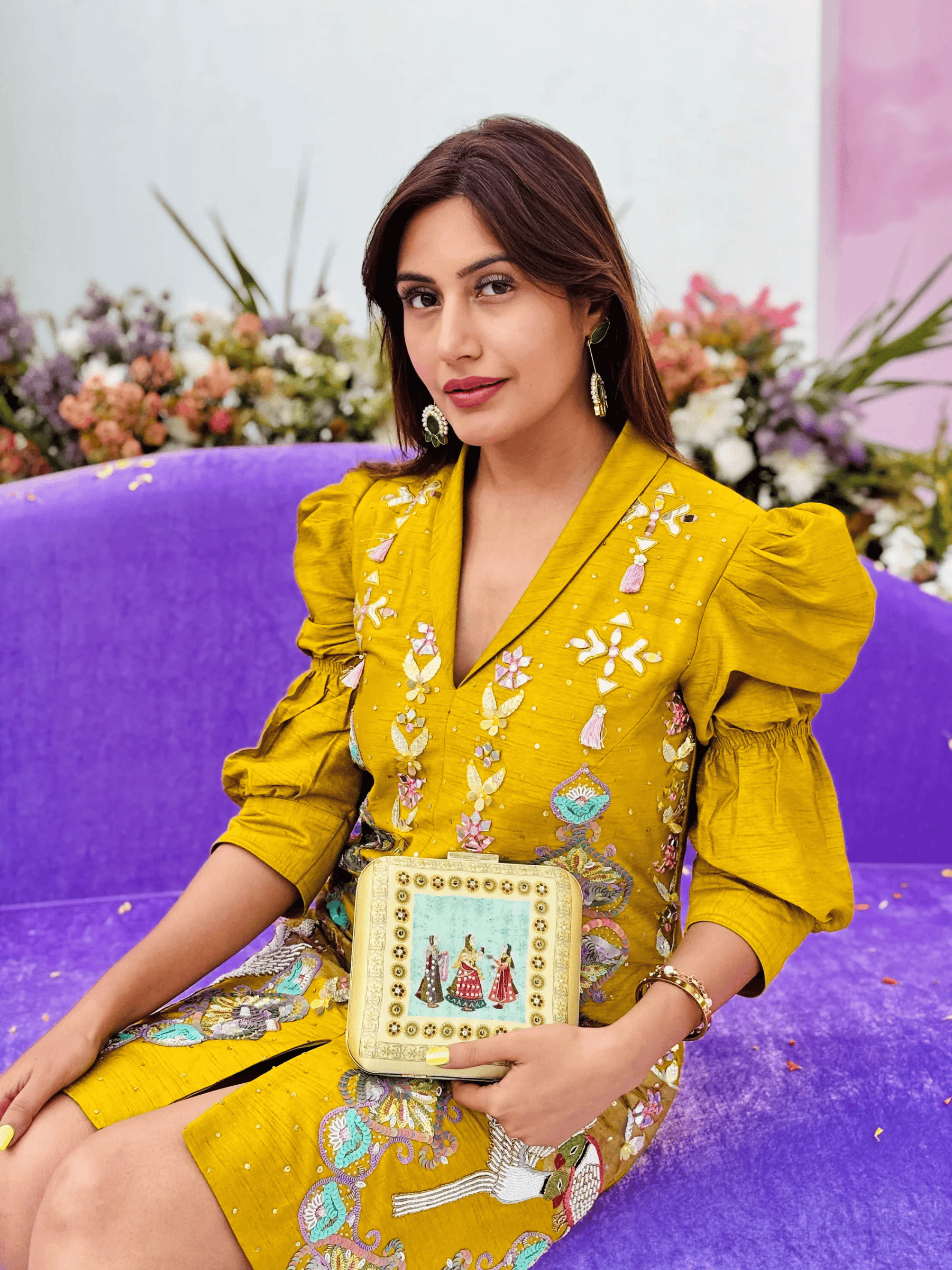 The royal queens' silhouettes are outlined with intricate zari embroidery, each stroke a testament to the grandeur of the moment. The clutch is adorned with Indian motifs and the print of royal jewels, evoking the sophistication and elegance of the royal court.