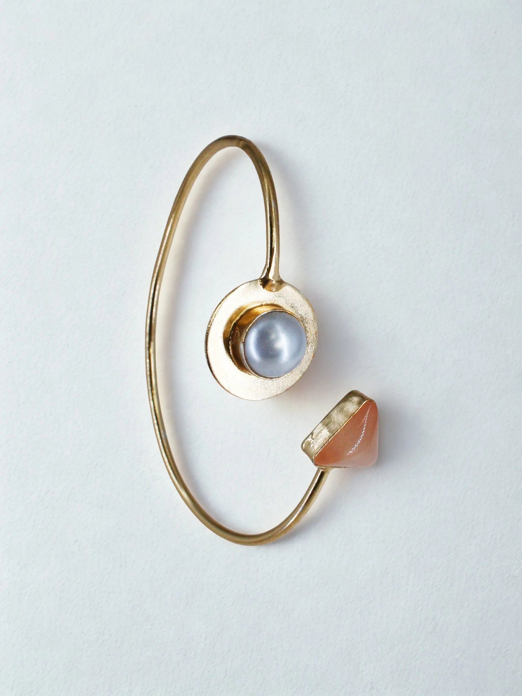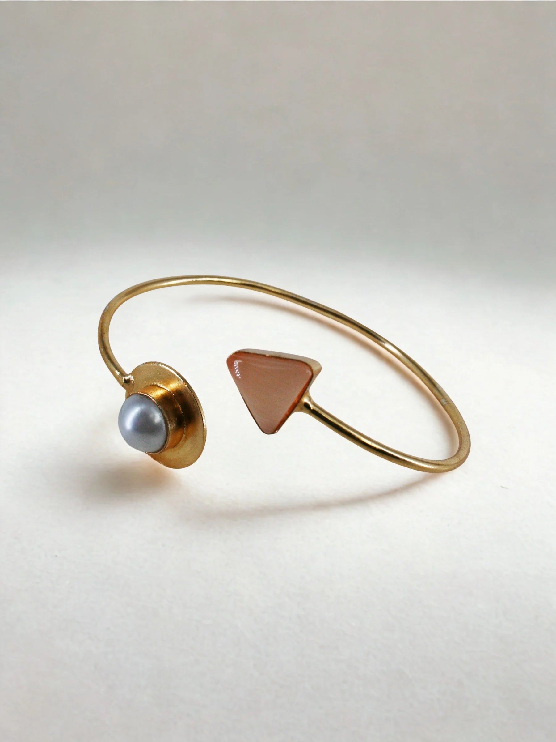 Handcrafted in recycled brass and finished with radiant 18K gold plating, the Seren Axis Bracelet balances a soft pink triangular stone on one side with a luminous pearl on the other — a modern axis of contrast and harmony. Its clean, sculptural lines bring Art Deco geometry into a quiet, contemporary form. Elegant, minimal, and deeply expressive, it’s a refined heirloom for the modern collector.
