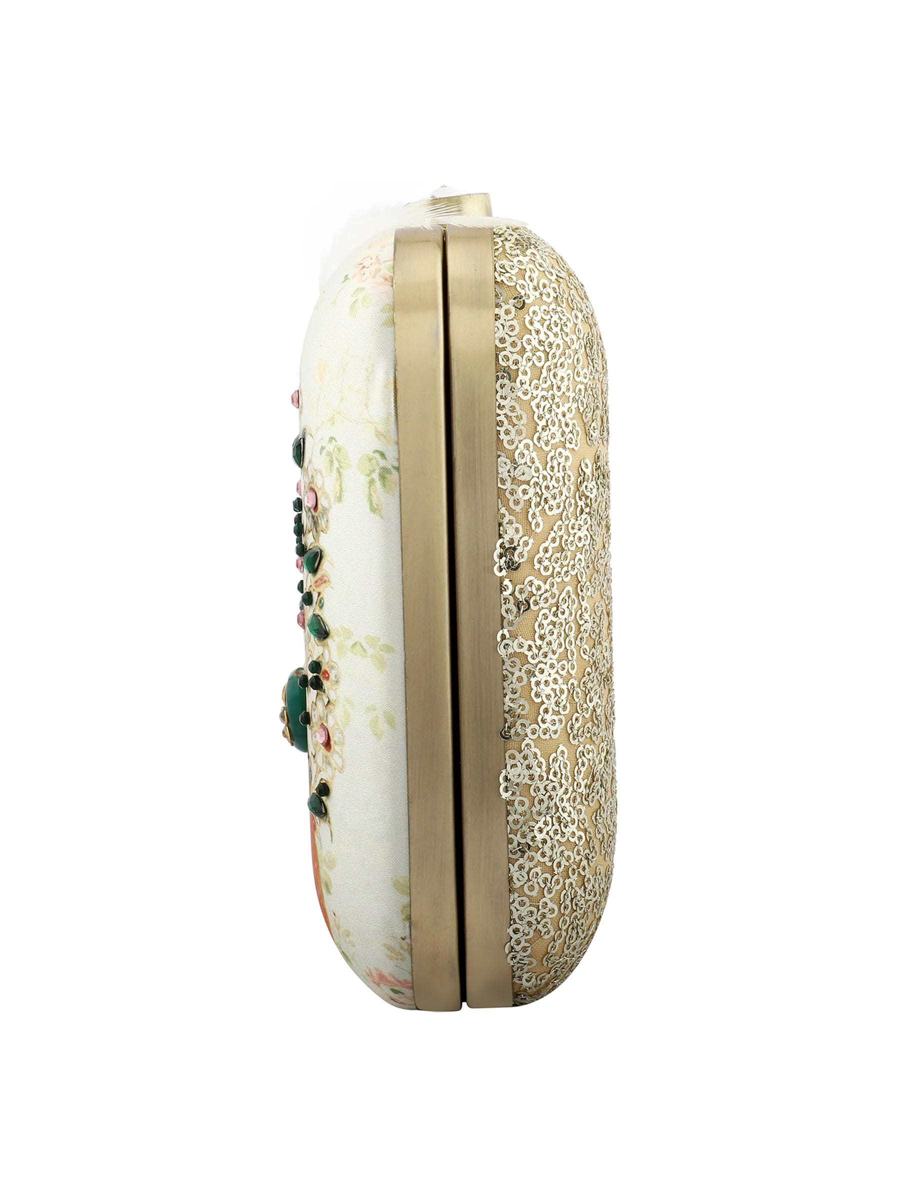 The Shahjahan Clutch is from the REGAL CHRONICLES COLLECTION by designer Puneet Gupta. Perfect addition to your festive look, the clutch is inspired by the opulent life of Indian royalty and their magnificent jewels. The Shahjahan Clutch pays homage to India’s imperial grandeur through hand embroidery and fine embellishment. Crafted with precision, it evokes the splendor of Mughal artistry while remaining a statement of modern sophistication. Ideal for weddings and special occasions, it reflects the poetic elegance that defines Puneet Gupta’s couture accessories.