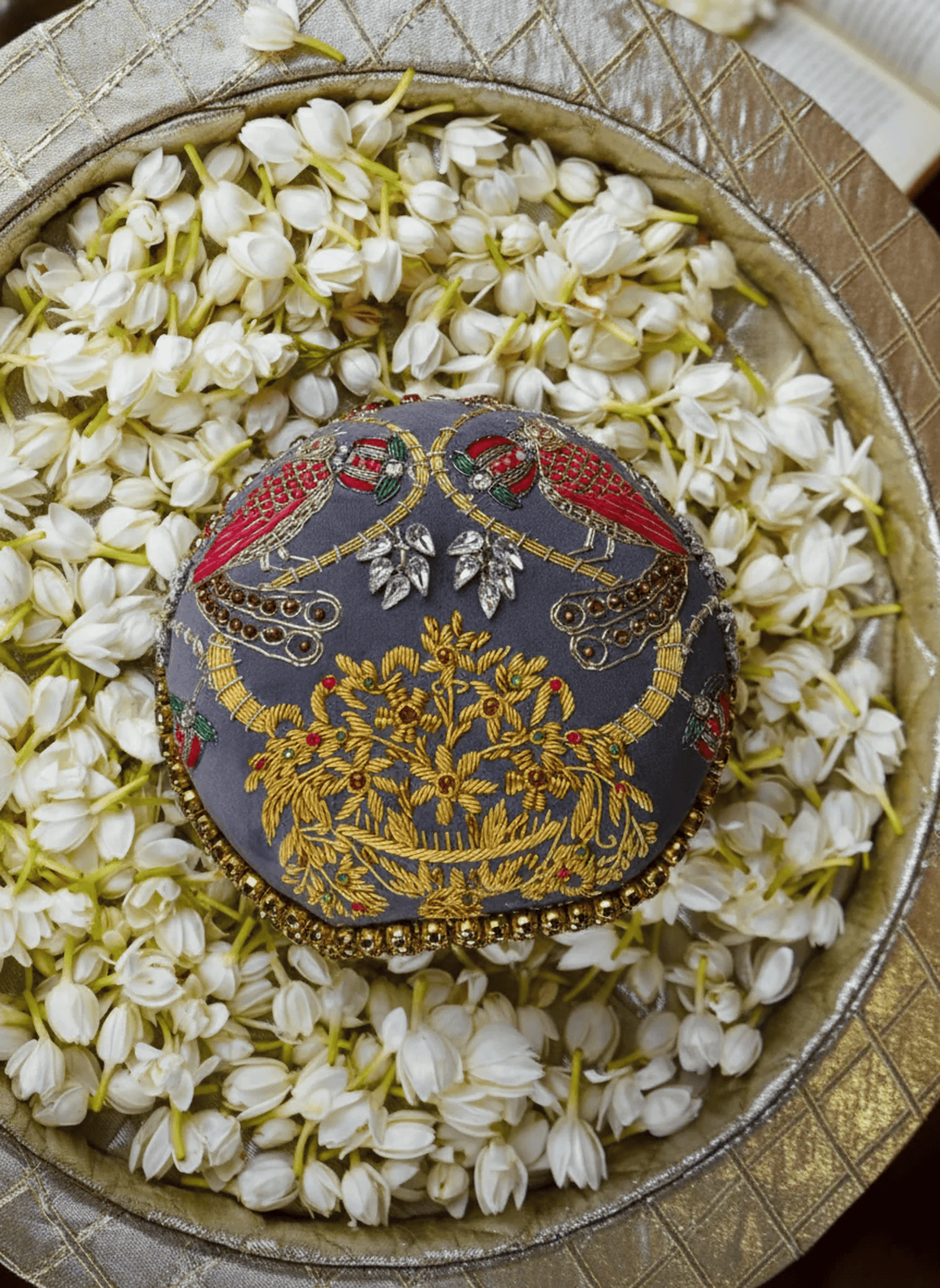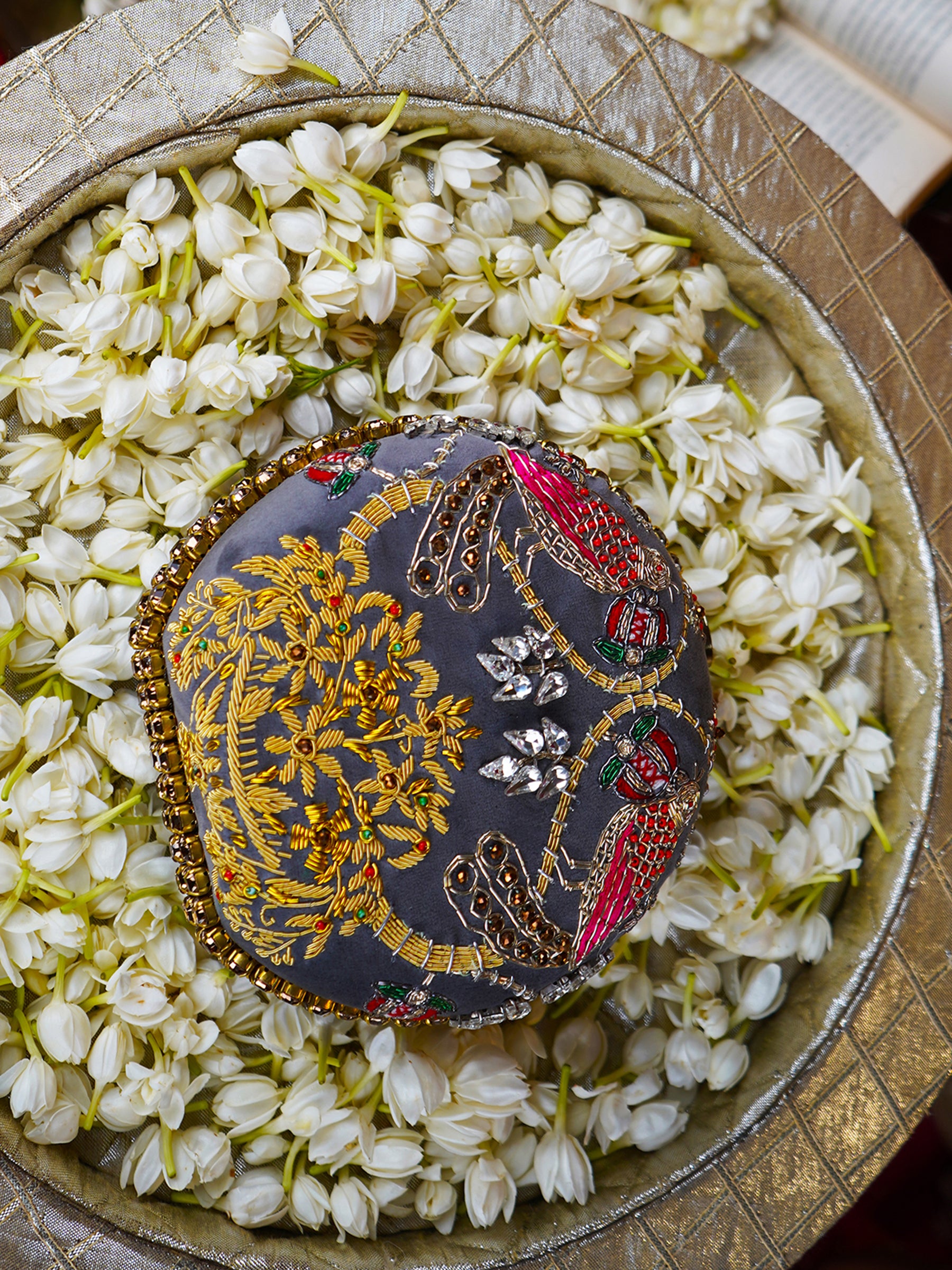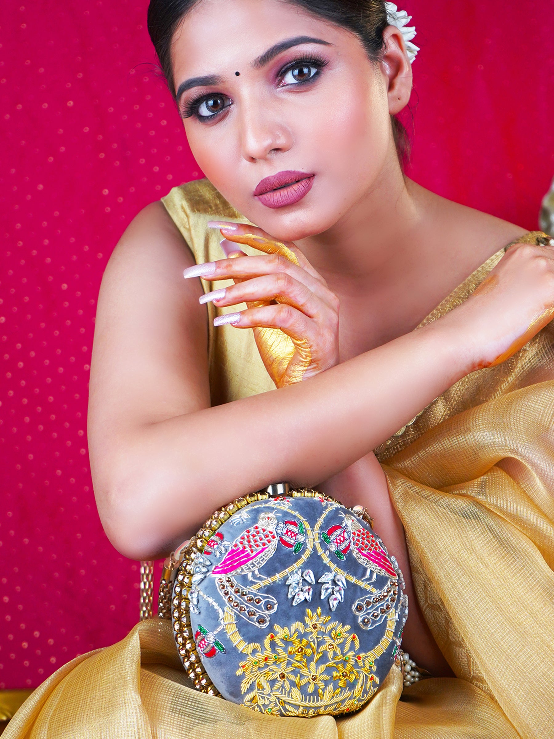 But what truly sets the "Shararti Paro" apart is the meticulously embroidered pair of parrots, poised in eternal grace. These magnificent birds, symbolizing love and beauty, enhance the clutch's sensual charm, making it a true work of art.