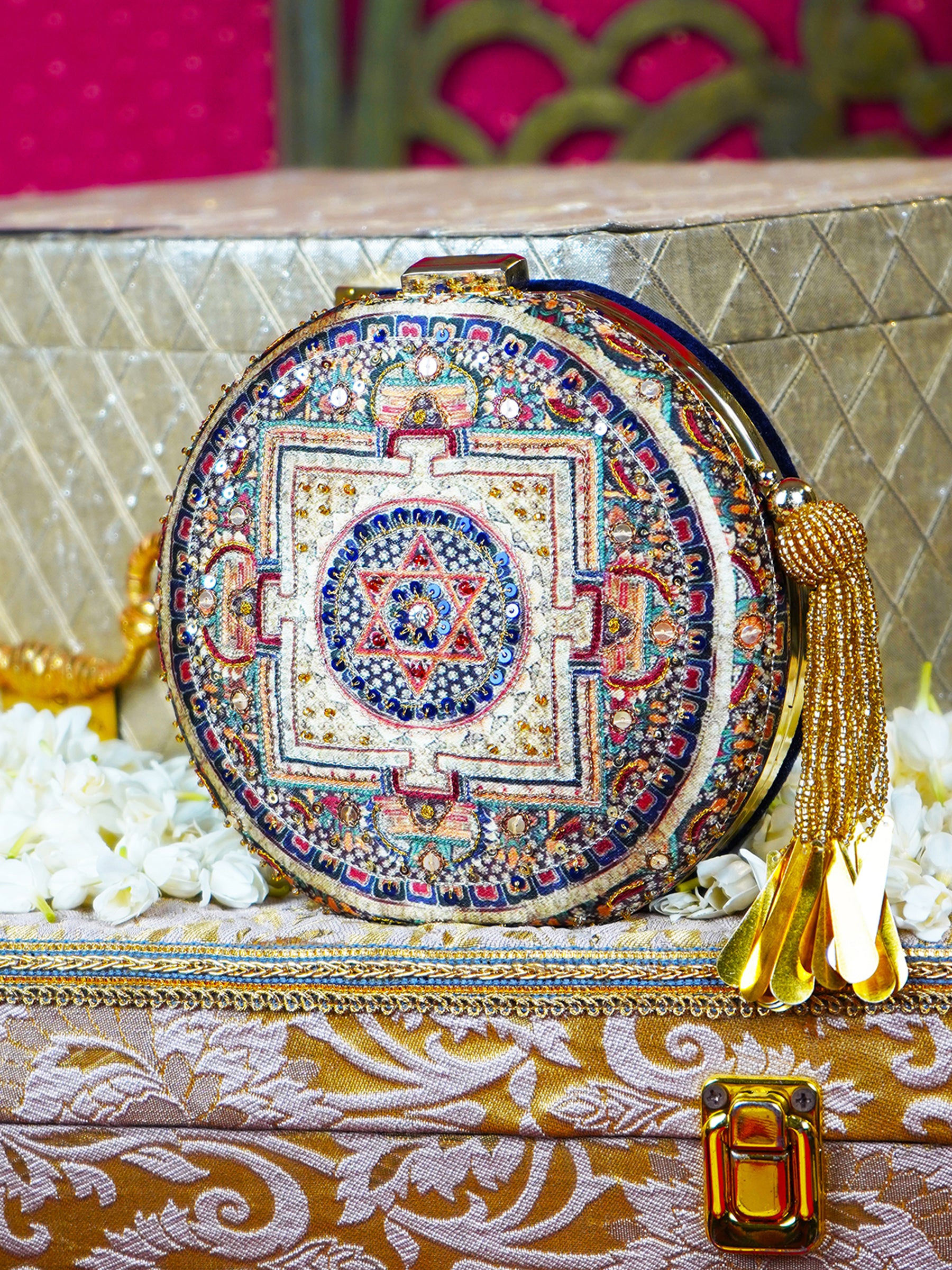 Elegance and luxury converge in the "Mandala Sitara Clutch," a celestial masterpiece crafted from sumptuous silk. It embodies opulence, sensuality, and the intricate artistry inspired by Indian mandalas.