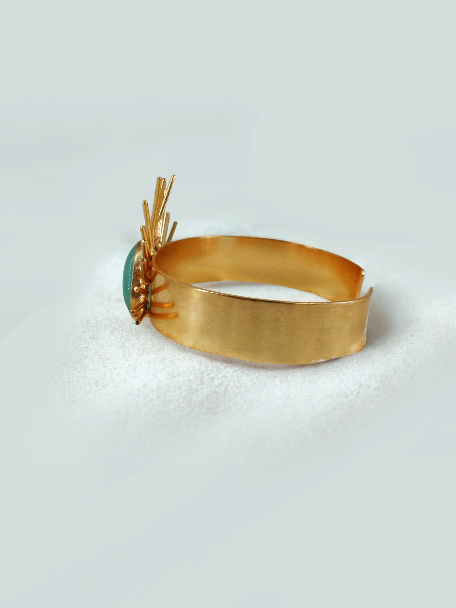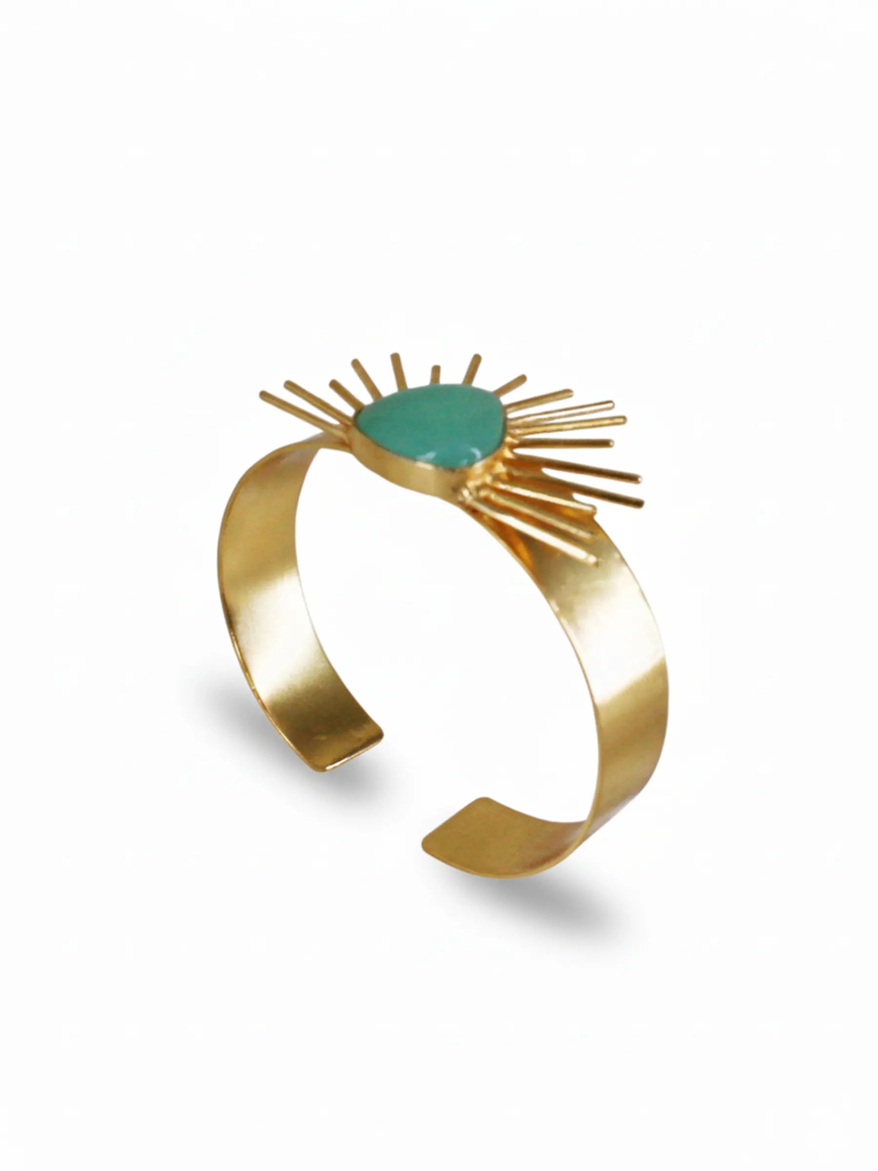 Handcrafted in recycled brass and finished in luminous 18K gold plating, the Solace Curve Bracelet features a smooth, sculptural band centered with a light-green triangular jade stone. Radiating metal rays extend outward from the stone, creating a serene interplay of geometry, light, and artisanal texture. A bold yet calming modern heirloom that channels Art Deco symmetry with organic elegance.