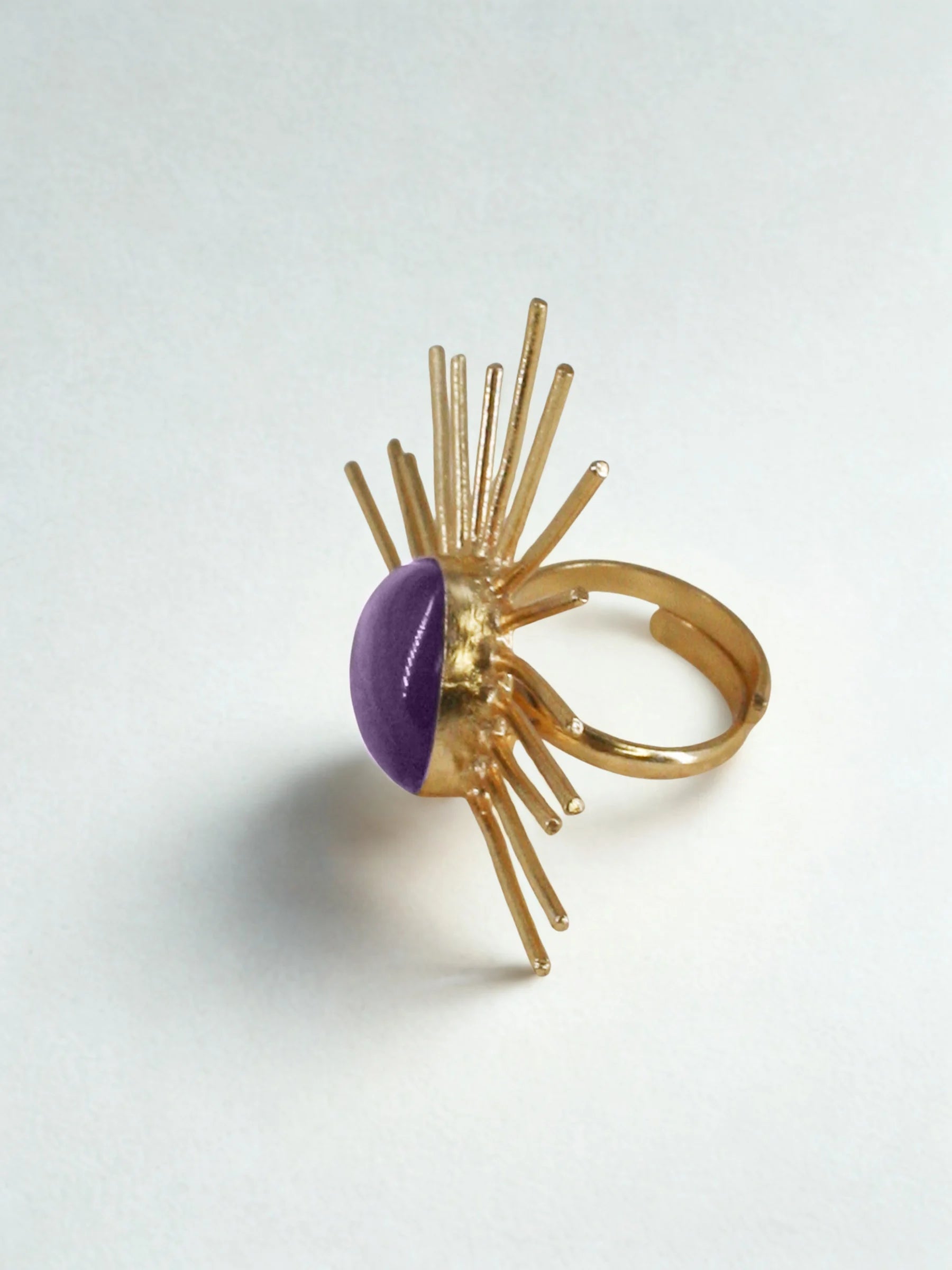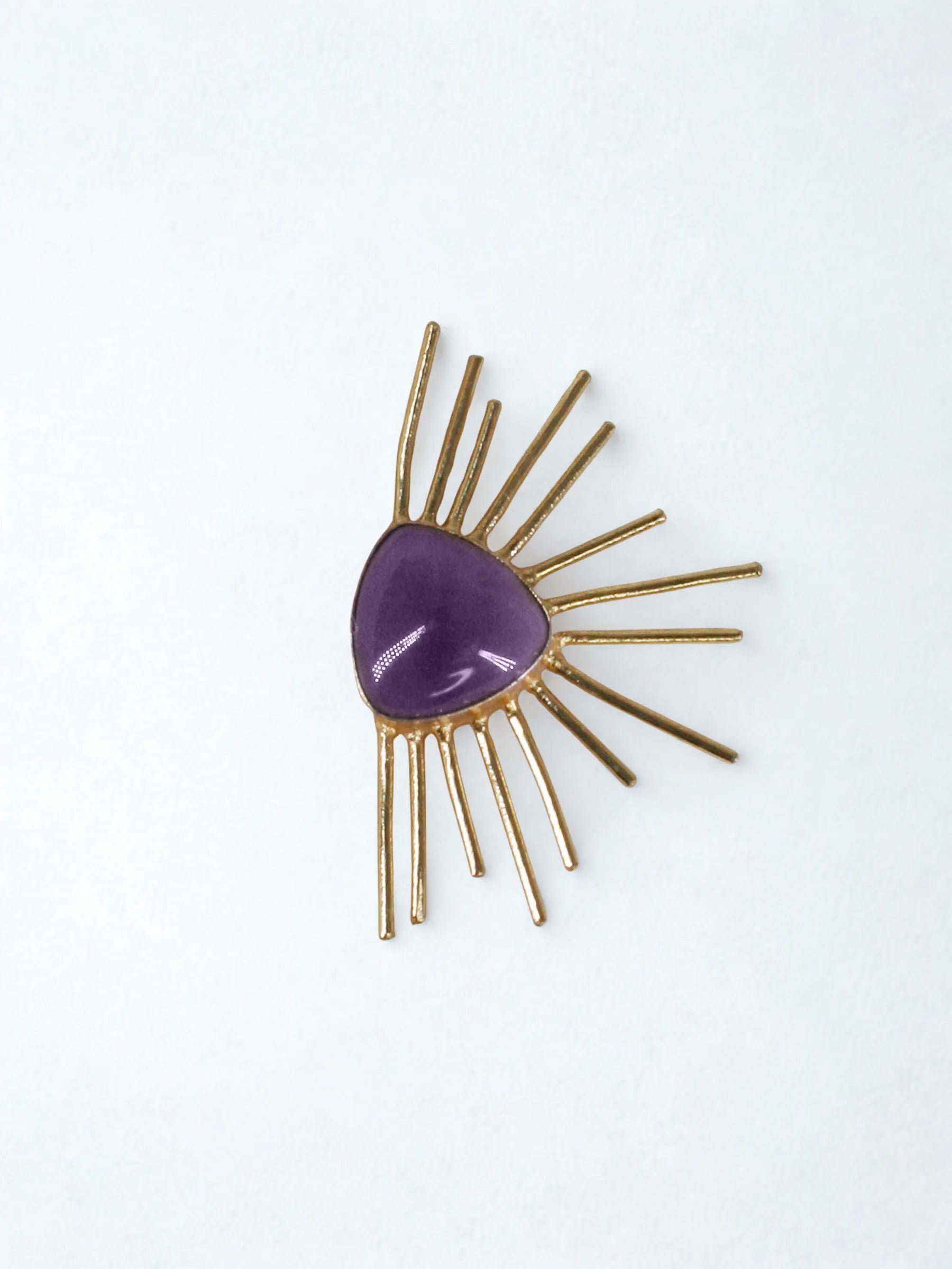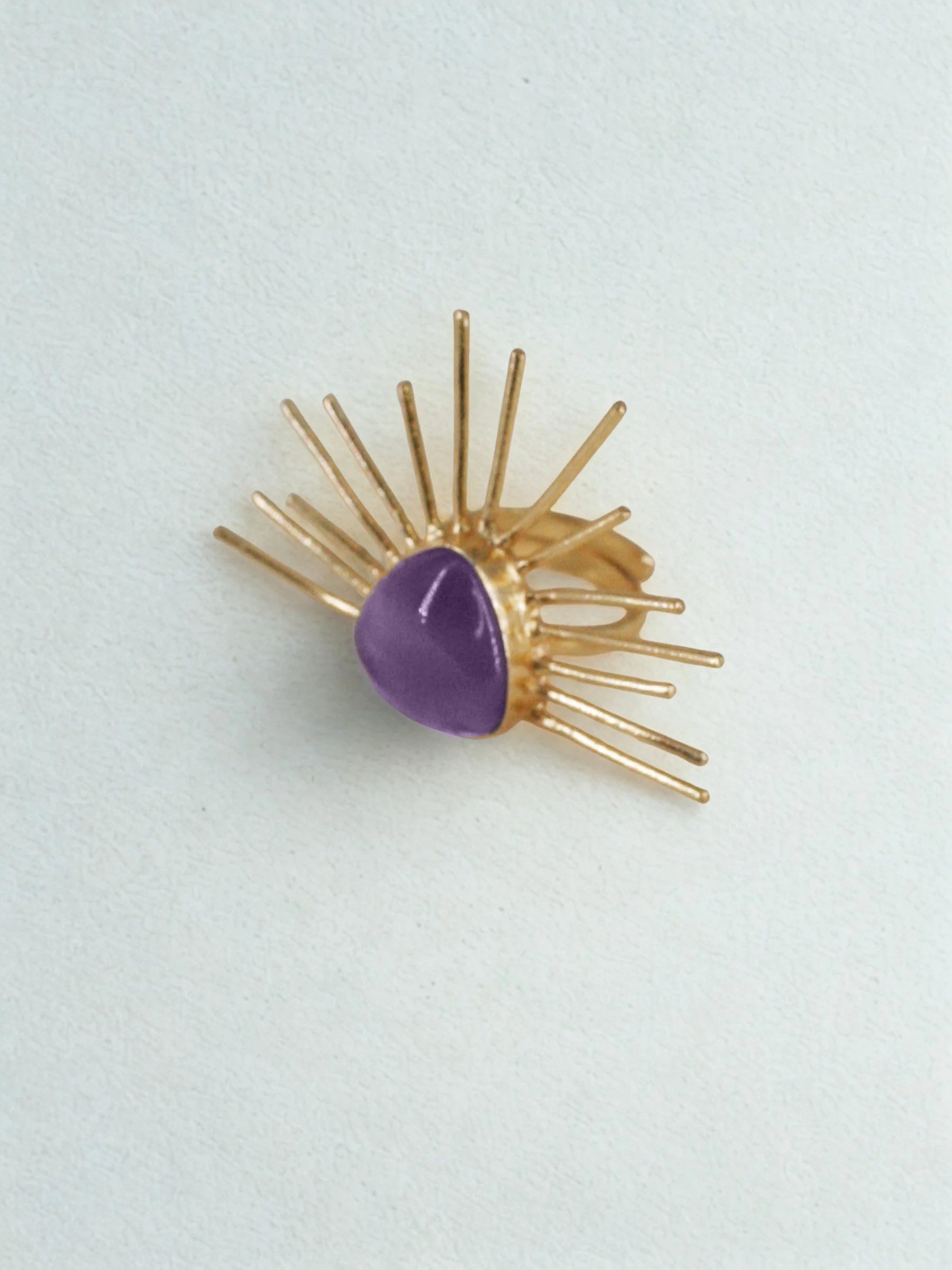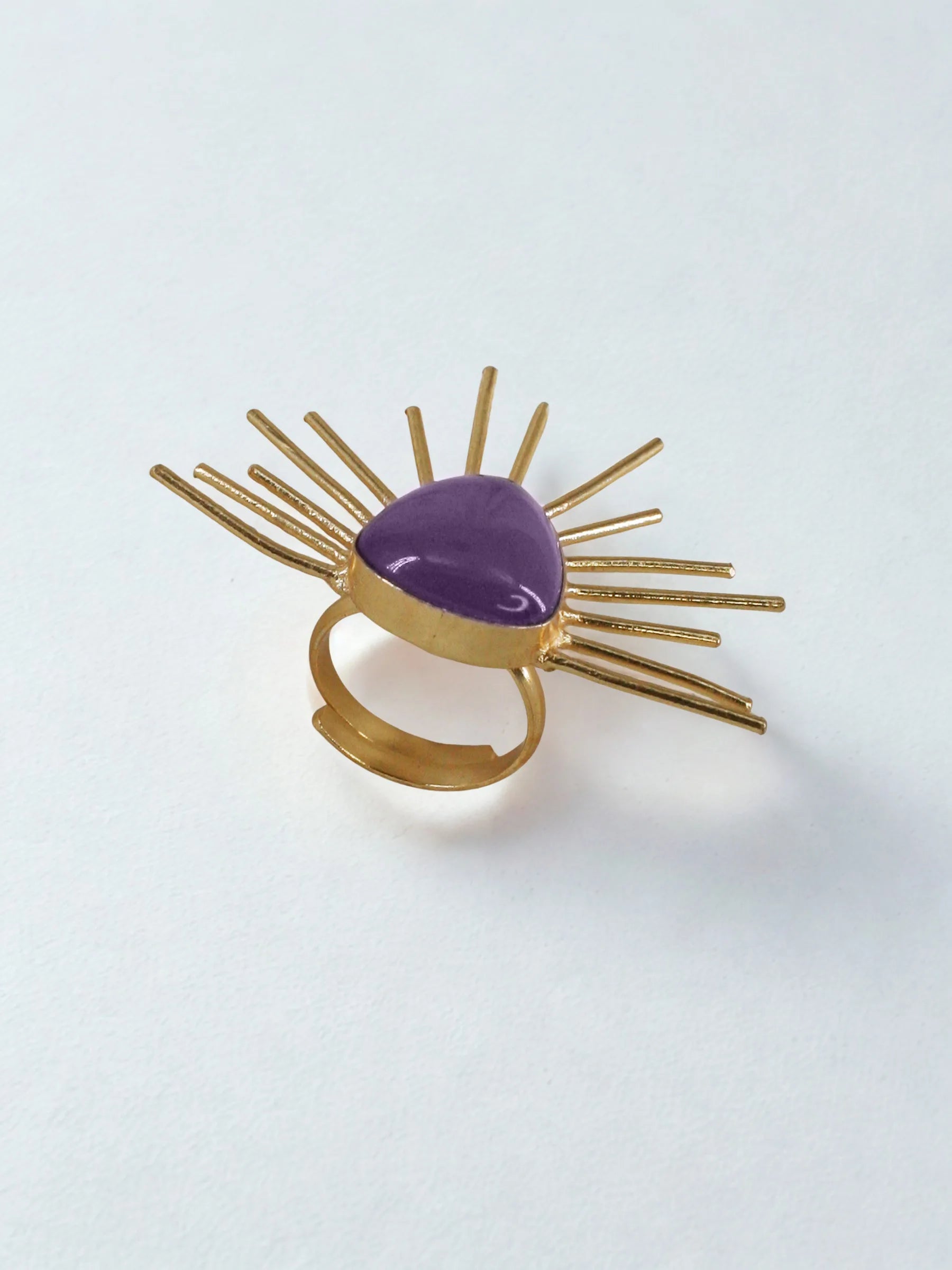 Handcrafted in recycled brass and finished with radiant 18K gold plating, the Solace Curve Ring centers a bold triangular stone, from which fine metal rays emerge in a sculptural burst. The contrast of sharp geometry and luminous lines creates a quiet sense of power and poise. A modern heirloom that captures the calm strength of light cutting through shadow.