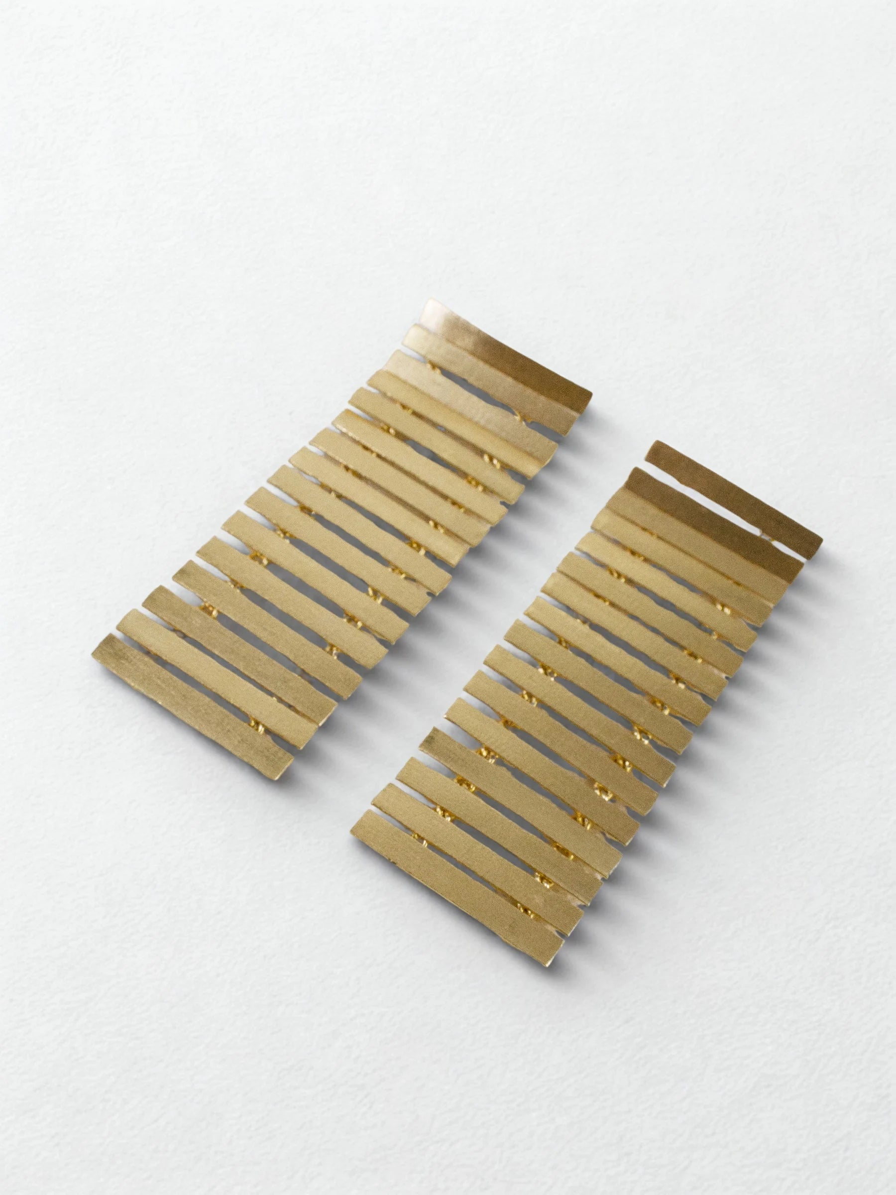 Handcrafted in recycled brass and finished with luminous 18K gold plating, the Solan Lines Earrings assemble sleek horizontal metal strips into a chic geometric rectangle. Clean, sculptural, and modern, the design captures the quiet symmetry of Art Deco minimalism. A polished everyday heirloom — refined, versatile, and effortlessly architectural.