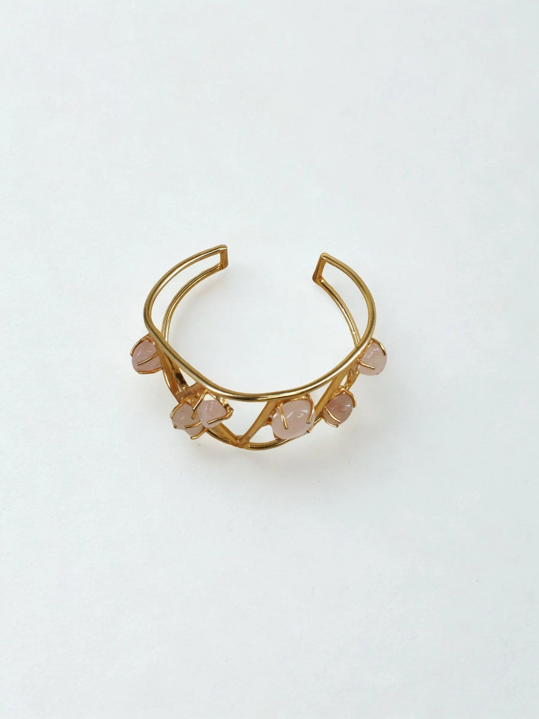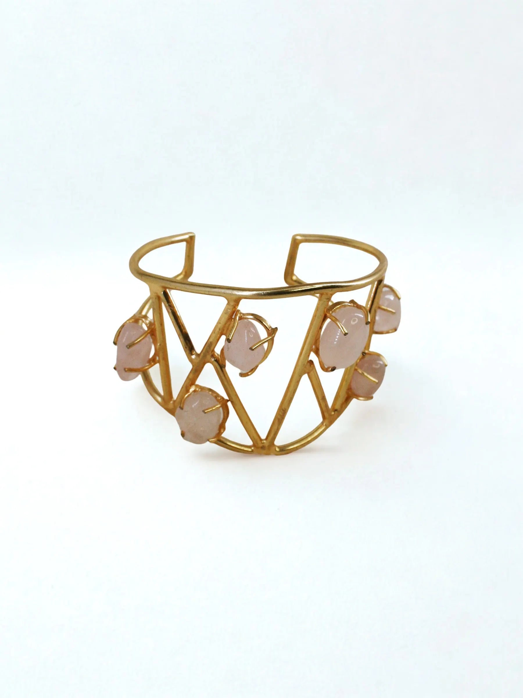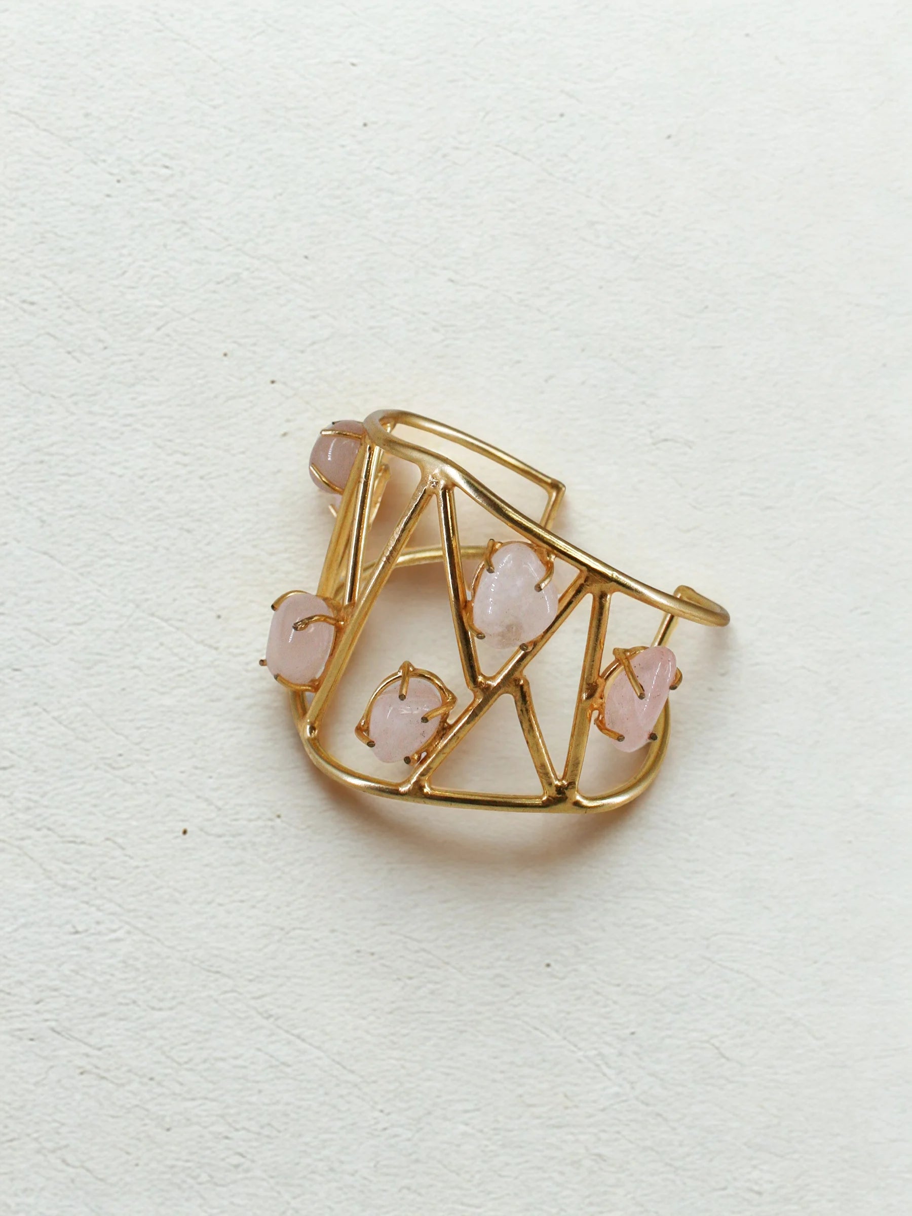 Handcrafted in recycled brass with a radiant 18K gold finish, the Solaris Meteor Handcuff features an abstract triangular grid scattered with polished rose-quartz stones. Like meteors streaking across a geometric sky, each stone brings a soft, luminous contrast to the sculptural framework. A bold modern heirloom that blends Art Deco precision with celestial poetry.