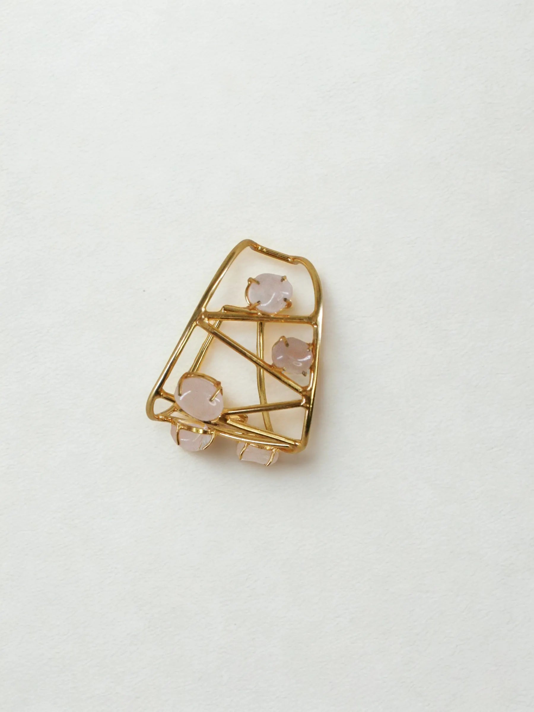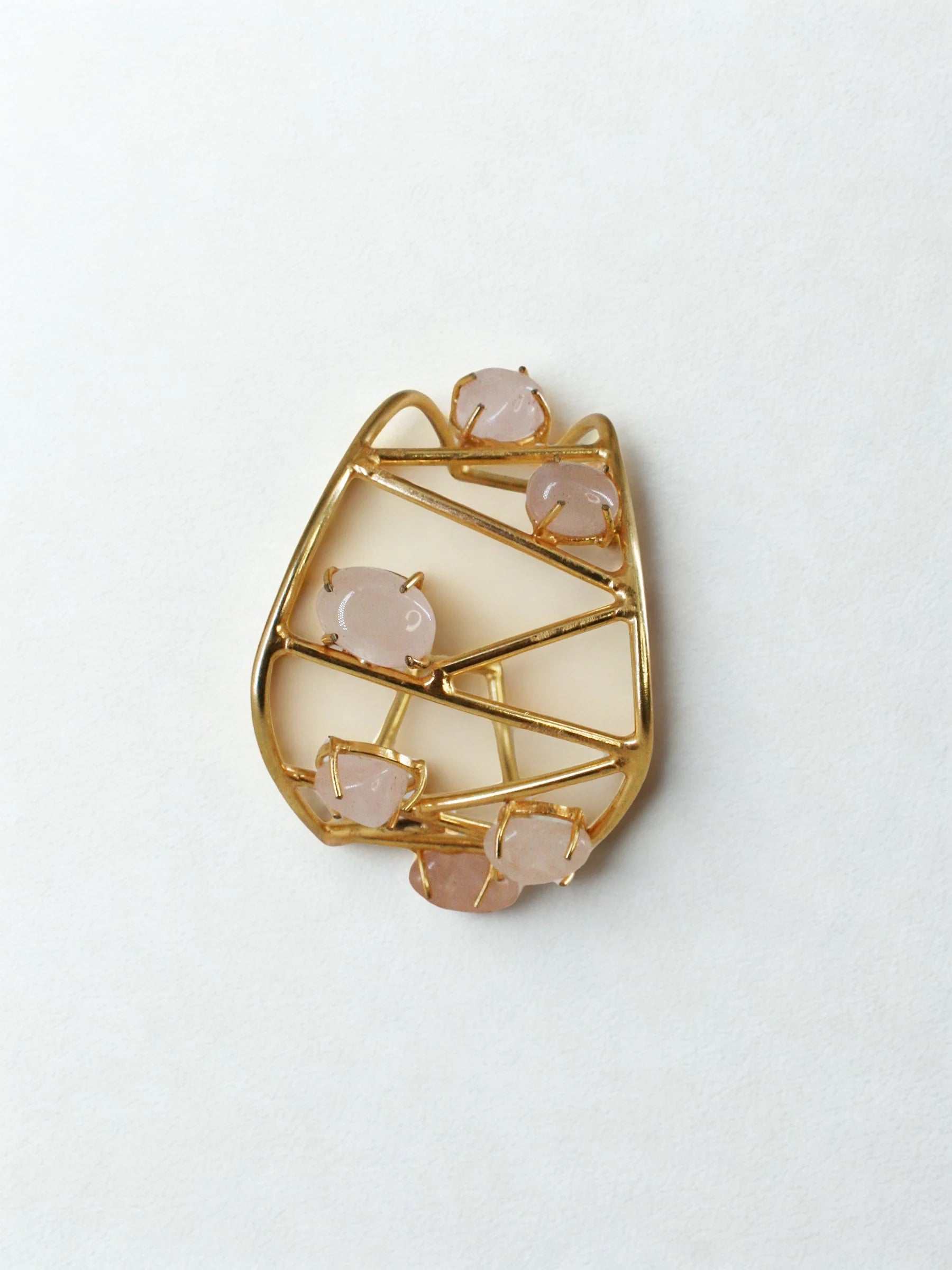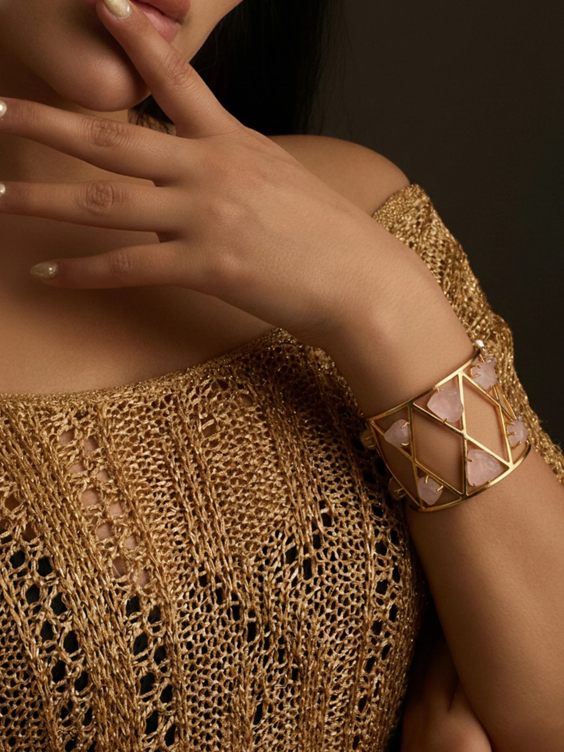 Handcrafted in recycled brass with a radiant 18K gold finish, the Solaris Meteor Handcuff features an abstract triangular grid scattered with polished rose-quartz stones. Like meteors streaking across a geometric sky, each stone brings a soft, luminous contrast to the sculptural framework. A bold modern heirloom that blends Art Deco precision with celestial poetry.