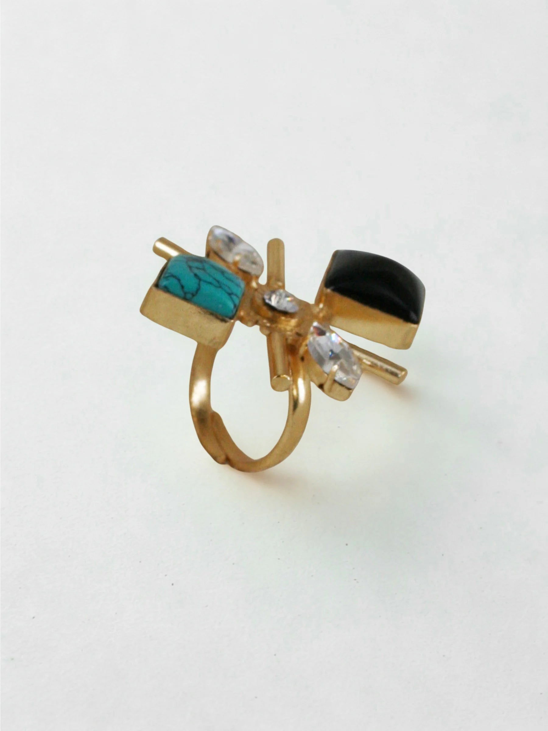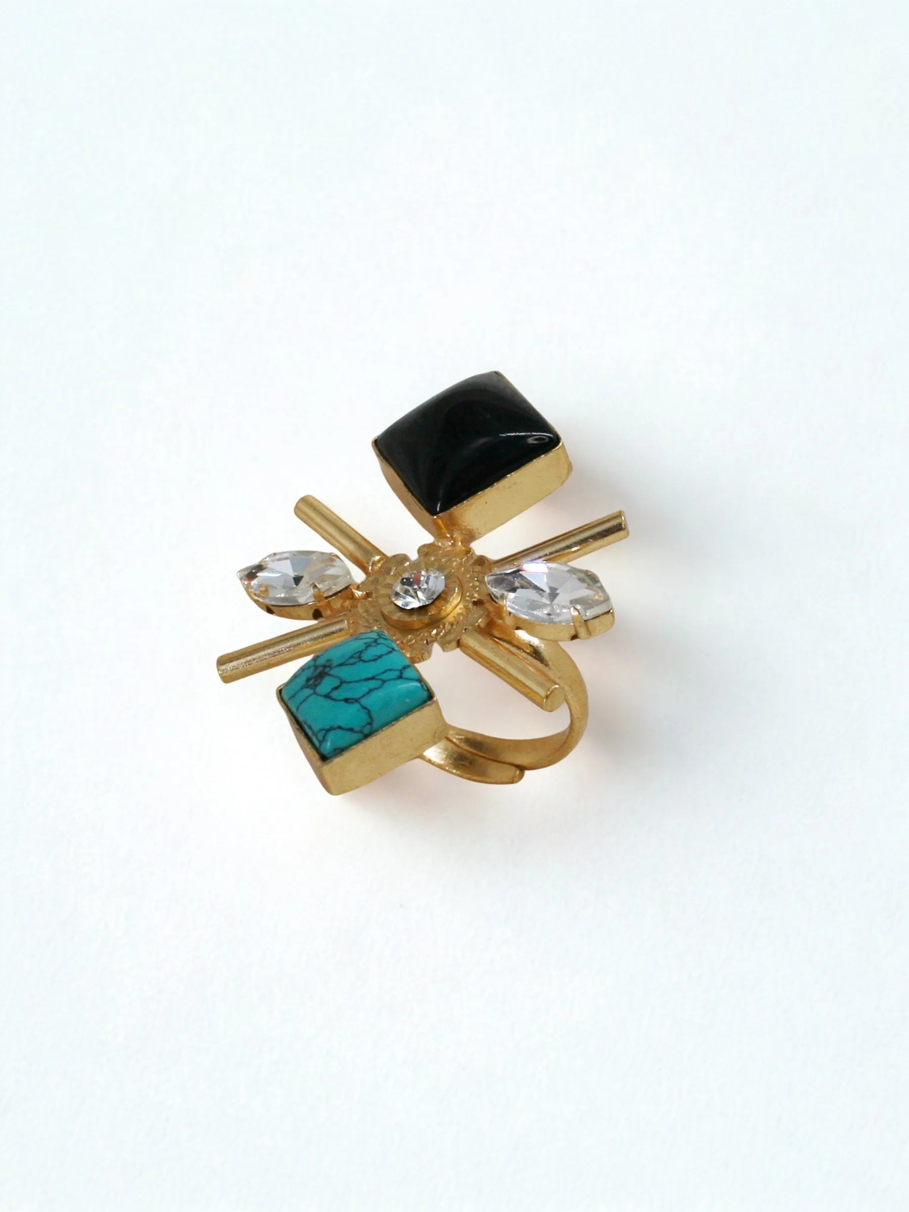 Handcrafted in recycled brass and finished with radiant 18K gold plating, the Starburst Ring forms an abstract celestial bloom — a striking arrangement of crystals, stones, and sculptural metal pipes radiating outward like a cosmic flare. Textural, luminous, and artfully asymmetric, it captures the energy of a star in motion. A bold modern heirloom for those drawn to light, geometry, and sculptural expression.