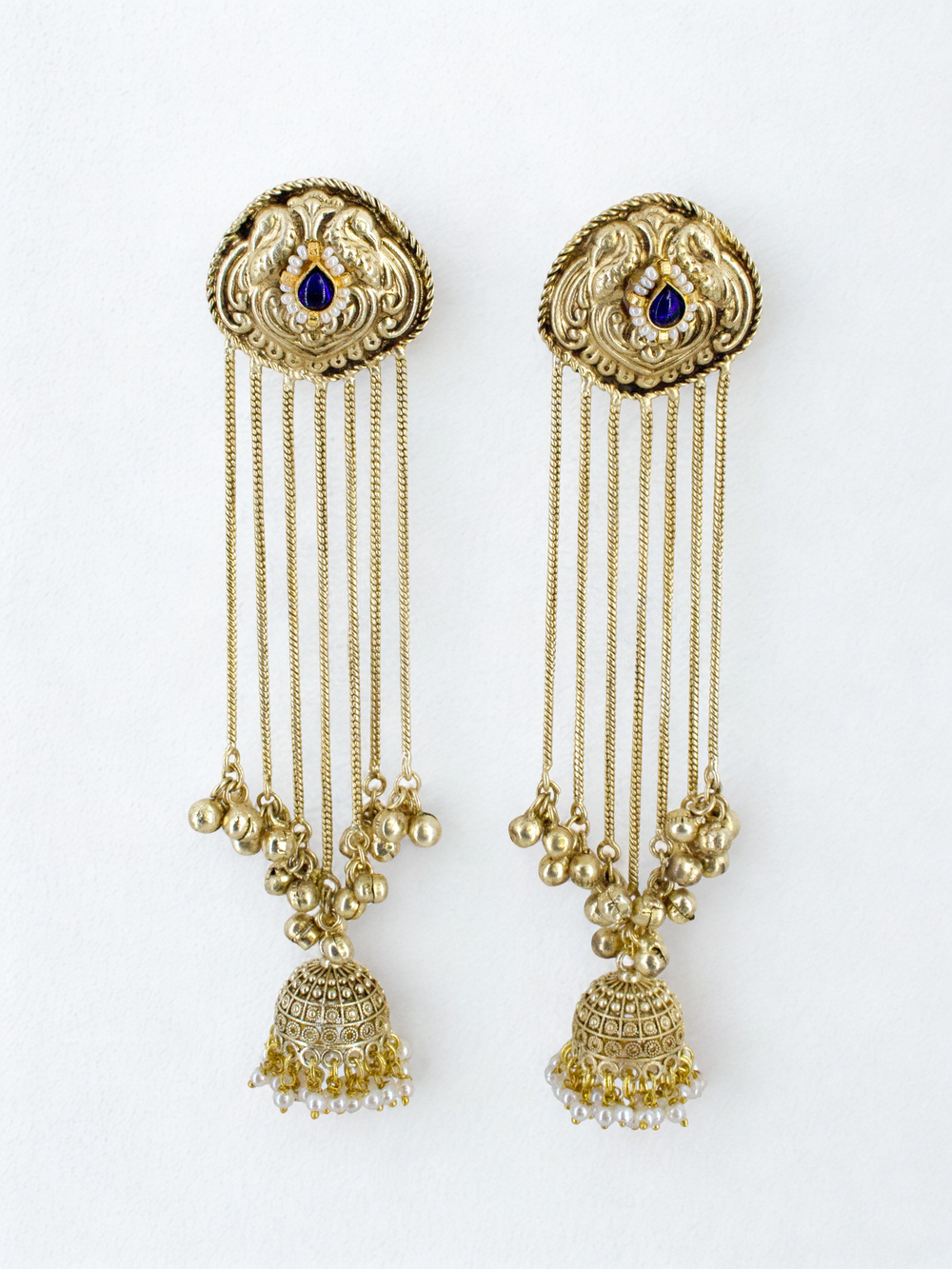 A fluid cascade of craft and culture, the Swarn Jharna Earring features shimmering chain tendrils flowing from a fusion temple-inspired stud, ending in a delicate golden jhumki. Handcrafted in recycled metal and finished with radiant 18K gold plating, the design captures the movement of falling gold — lyrical, ornate, and timelessly expressive. A modern tribute to temple artistry, rendered with sculptural softness and an effortlessly contemporary allure.