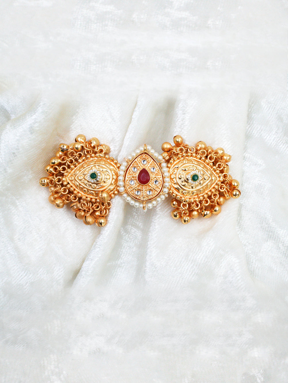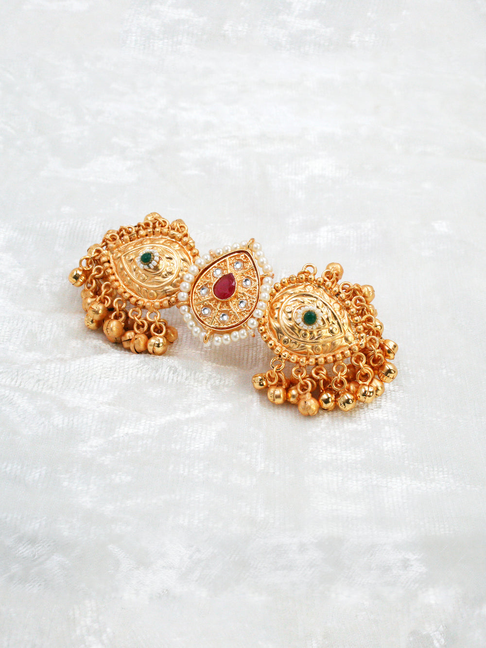 A commanding ode to temple grandeur, the Trilokya Ring spans three fingers in a sculptural sweep of yellow-gold artistry. At its heart rests a round, medallion-like brooch form, flanked by two leaf-shaped panels that extend gracefully across the hand. Handcrafted in recycled metal and finished in radiant 18K gold plating, this elongated silhouette feels ceremonial, powerful, and exquisitely architectural. More than a ring — it is a statement of realms, radiance, and regalia.