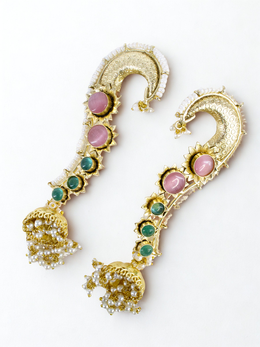 A poetic blend of heritage and innovation, the Varnika Karnphool reimagines the classic ear-ornament through a modern sculptural silhouette. Designed as an elegant earcuff, it pairs luminous stone settings with traditional kundan-inspired detailing, all handcrafted in recycled metal and finished with radiant 18K gold plating. The form curves gracefully along the ear, offering the drama of a statement piece with the softness of timeless craft. Contemporary yet rooted, refined yet expressive — a modern heirloom that celebrates the art of adornment in its most evocative form.