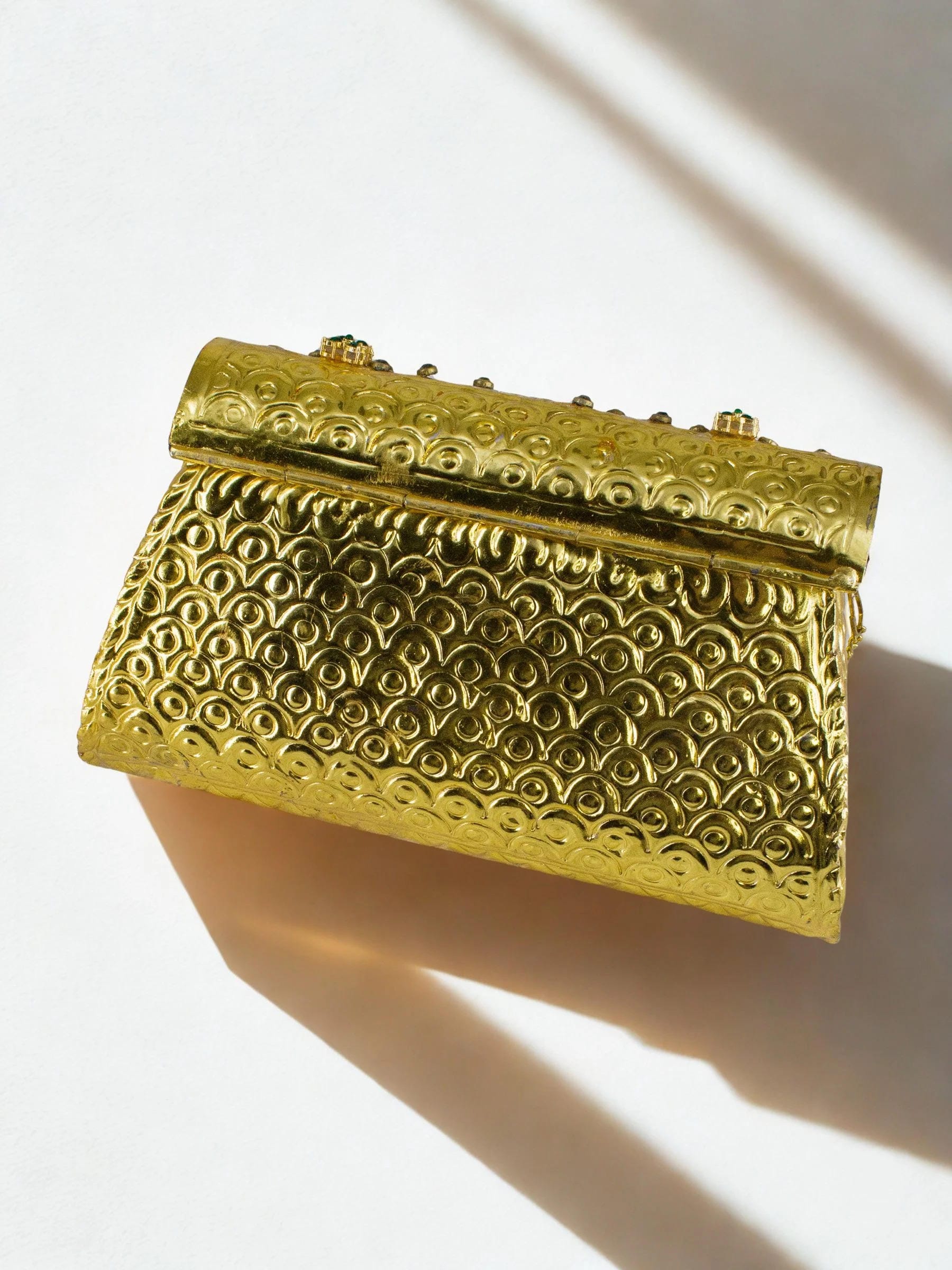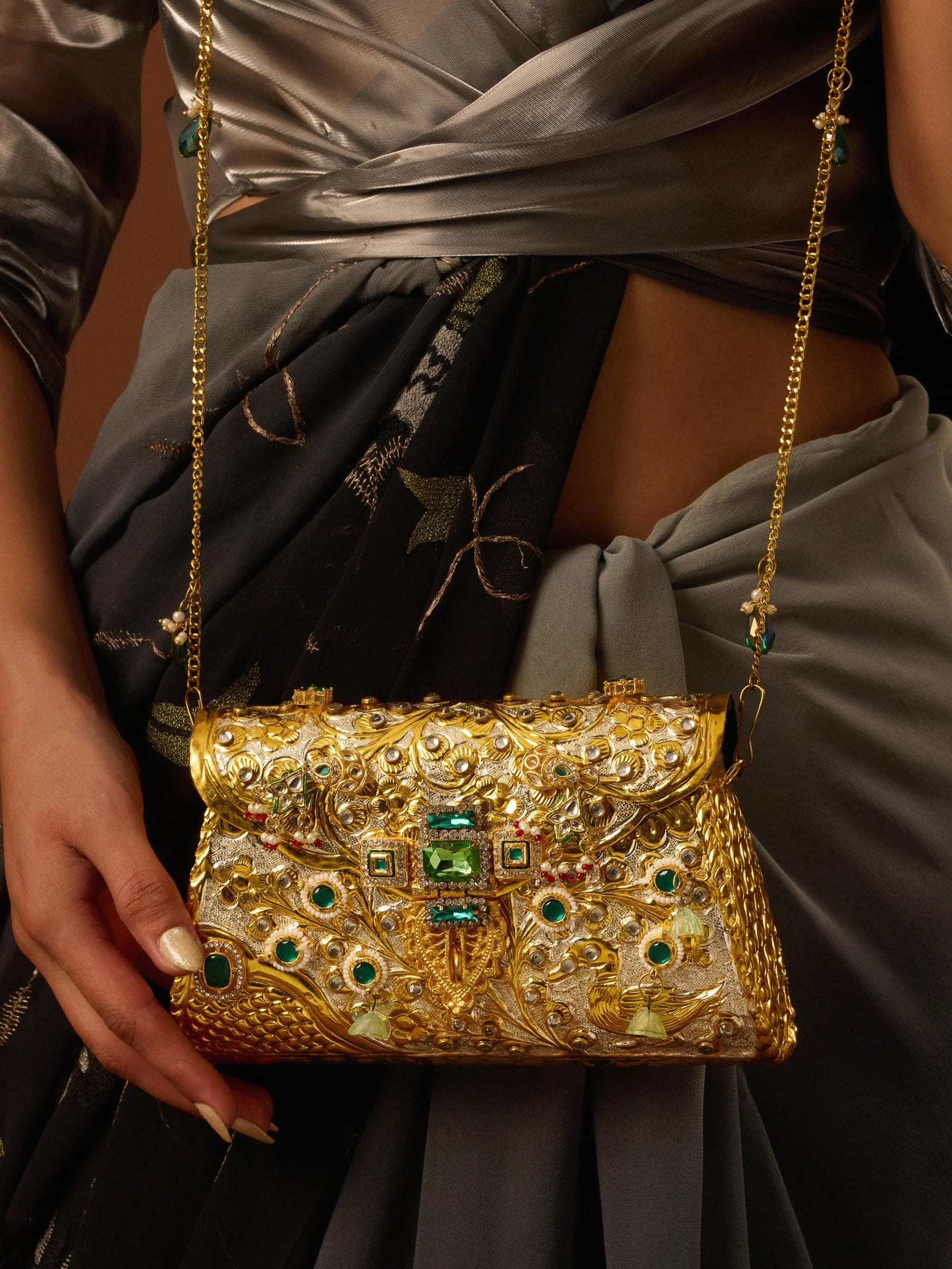 A dance of nature captured in metal and jewels, this silver-gold purse transforms traditional repoussé foliage into a story of elegance. One side is adorned with a regal duck motif, while emeralds and green stones shimmer across its surface like morning dew. Pastel green handmade glass jhumkis and delicate pearl motis punctuate the design, lending movement and playful charm. Verdant Reverie is more than a bag — it’s a miniature garden of craftsmanship, whimsy, and timeless beauty.