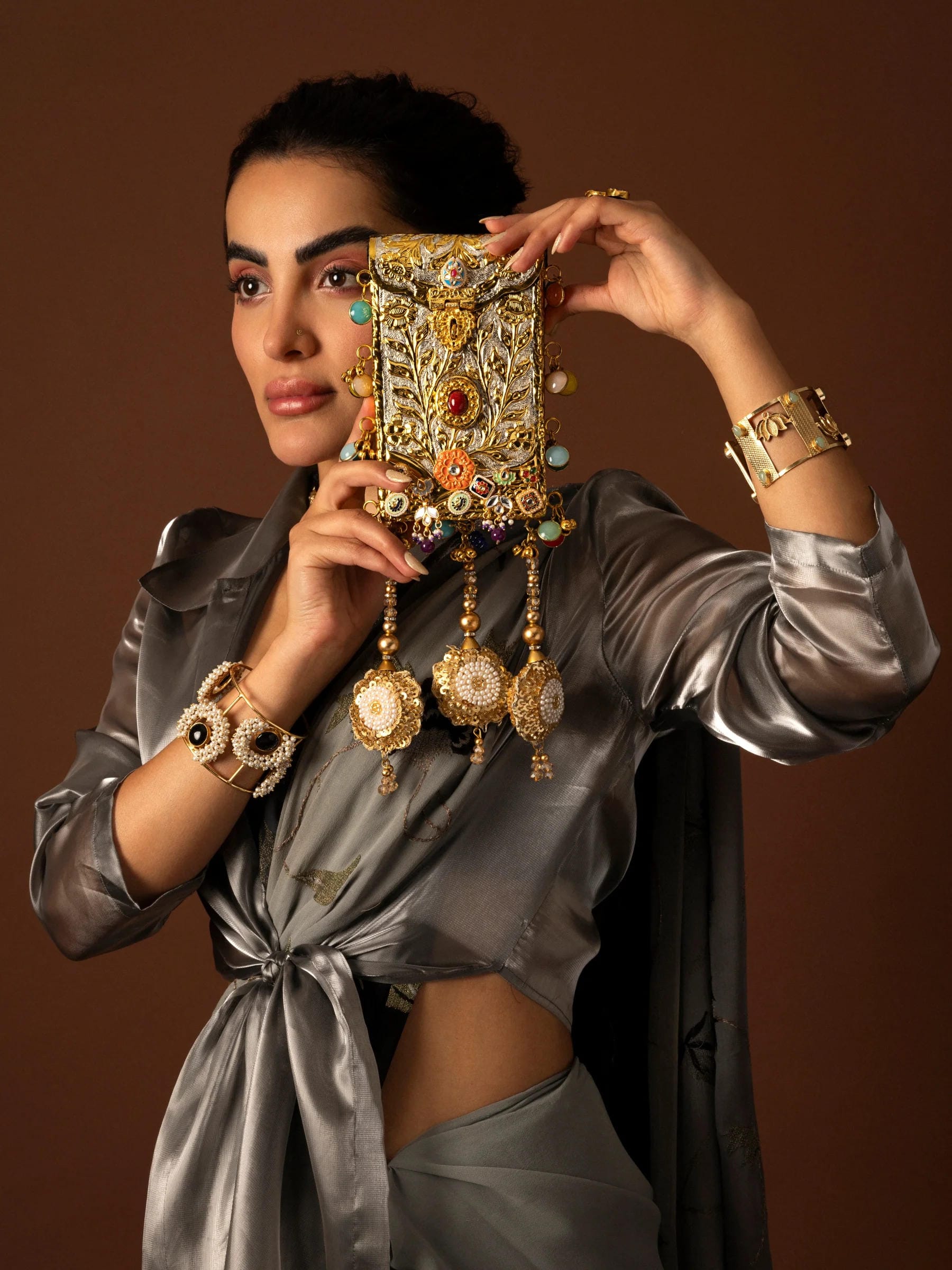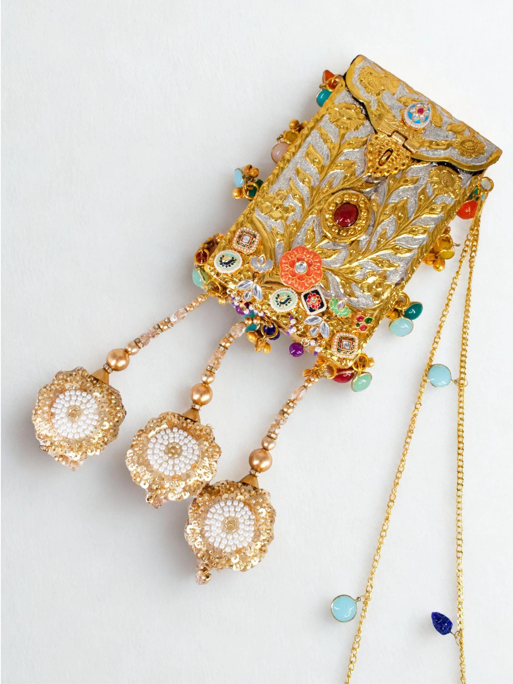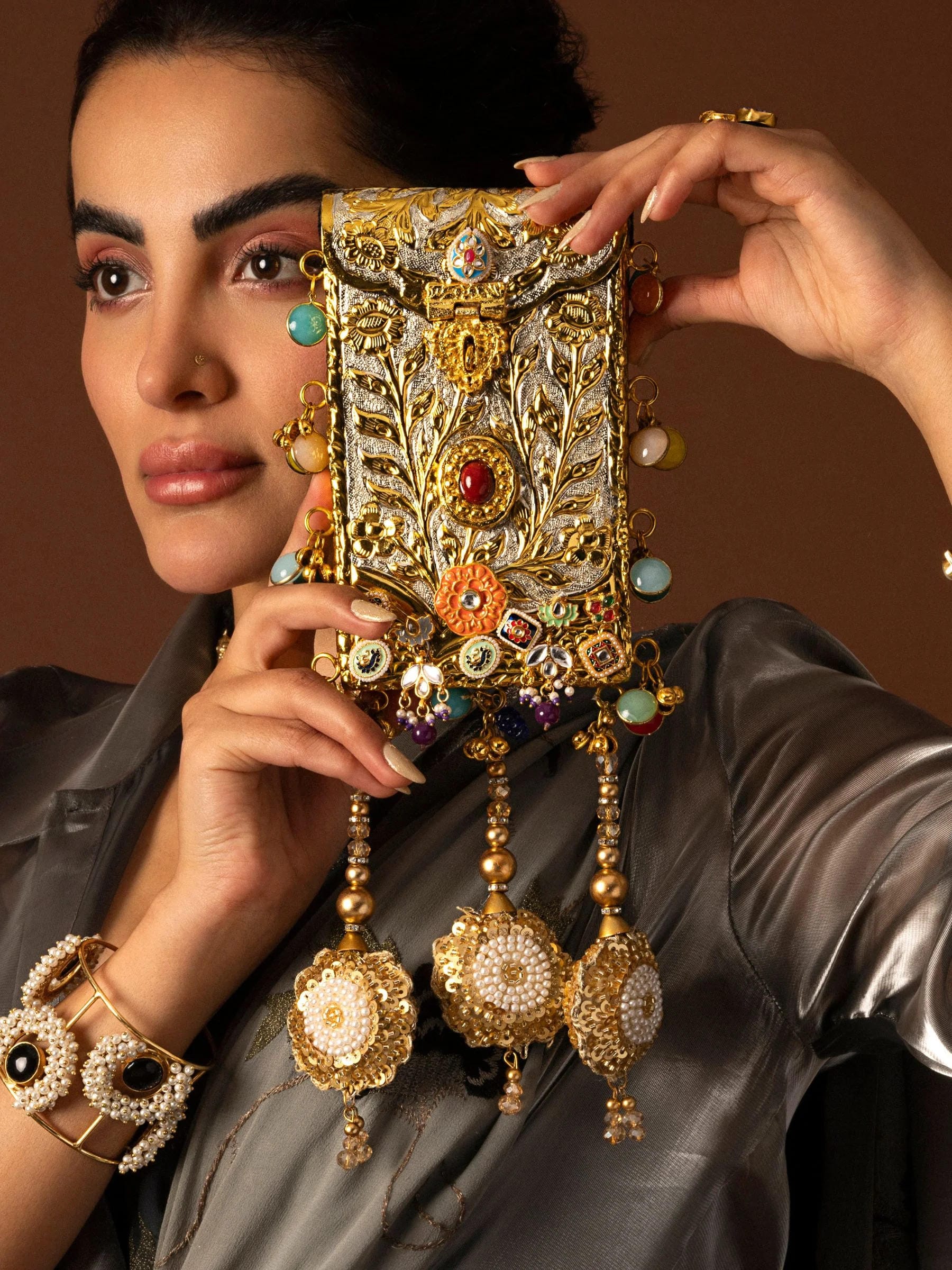 Named after zardozi, the ancient Indian art of gold-thread embroidery, the Zard Nomade Box Bag transforms textile opulence into sculpted metal elegance. Each face is hand-engraved with intricate motifs reminiscent of royal carpets and Mughal brocade borders. Jewel clusters punctuate the surface like tiny embroidered knots, glimmering with quiet extravagance. Dangling from the edges, hand-blown multicoloured glass beads add movement, texture, and a whisper of whimsy. A true ode to the free-spirited sophisticate, Zard Nomade celebrates luxury that feels lived-in, layered, and gloriously boho-beautiful.
