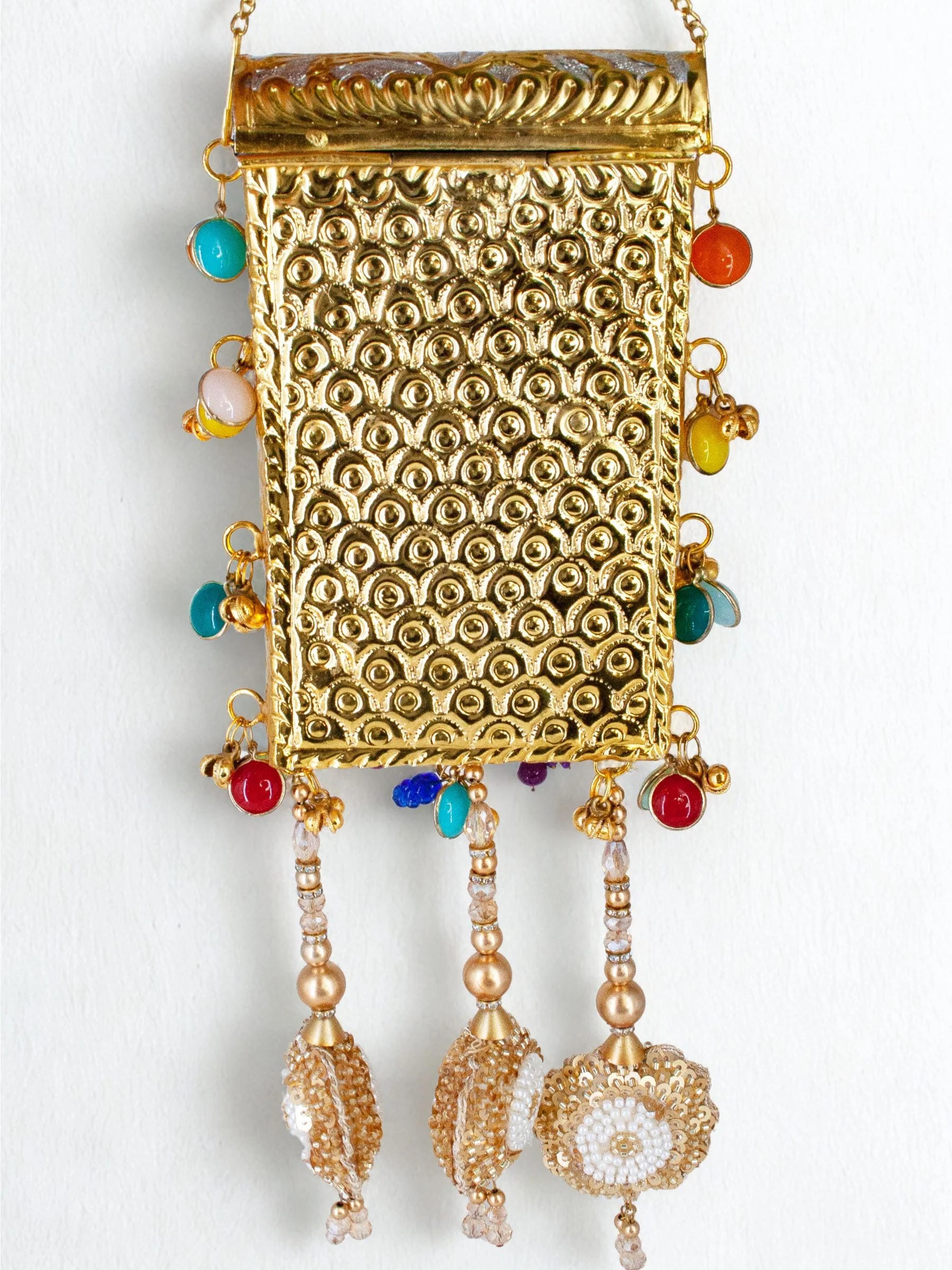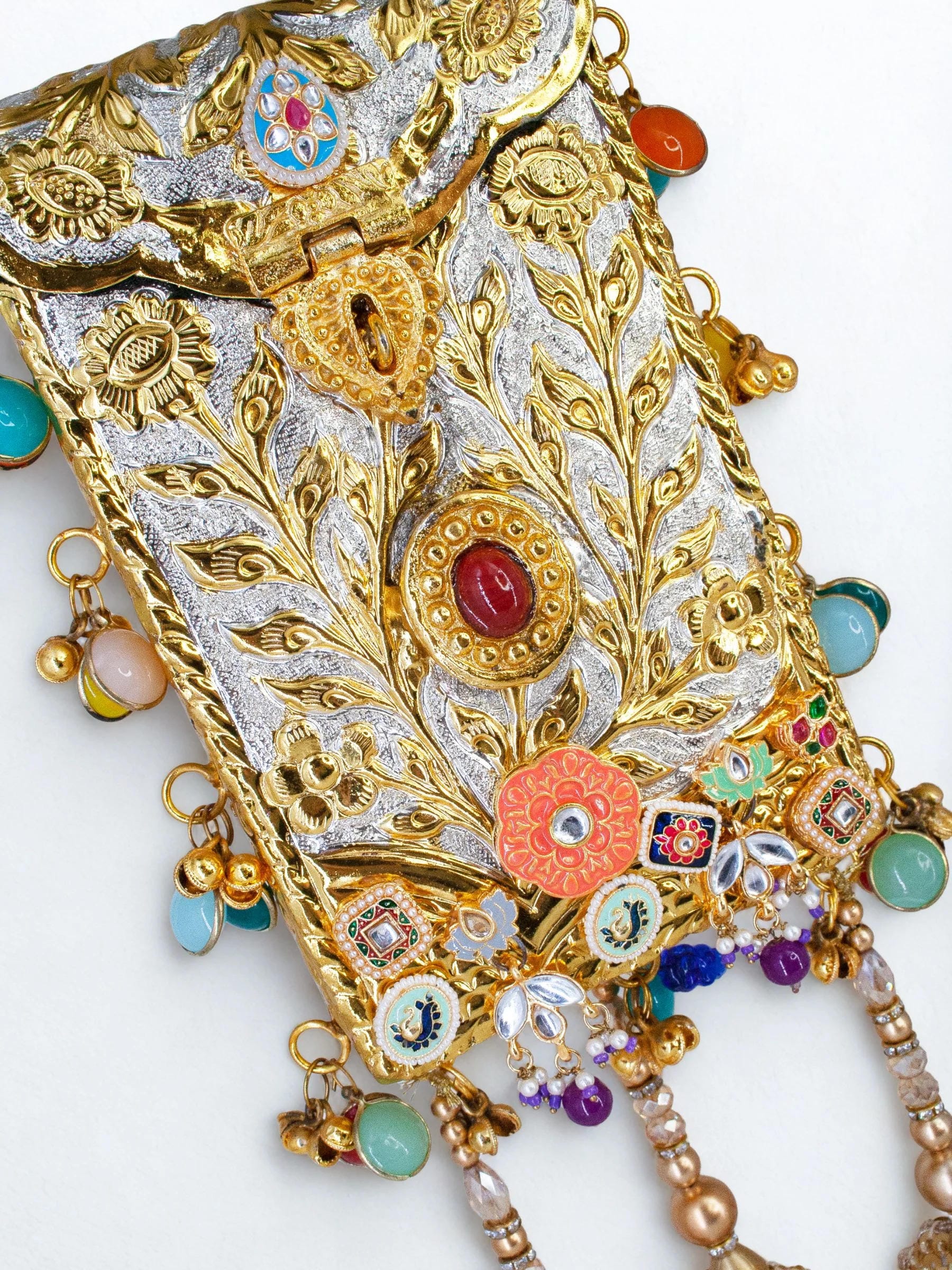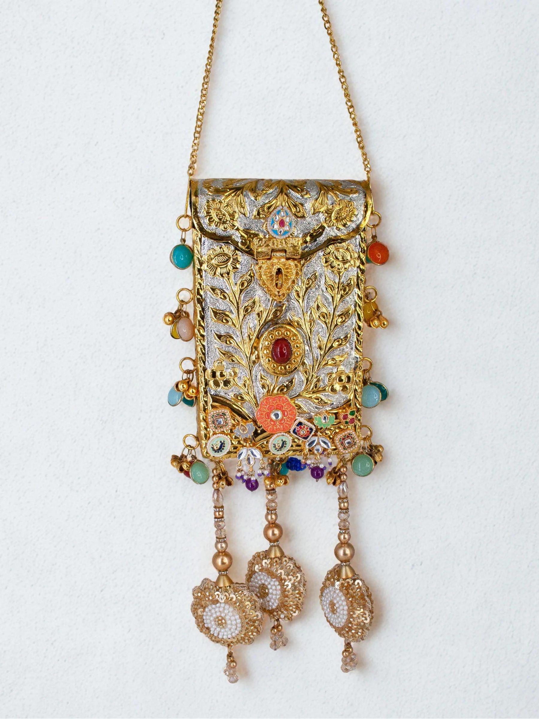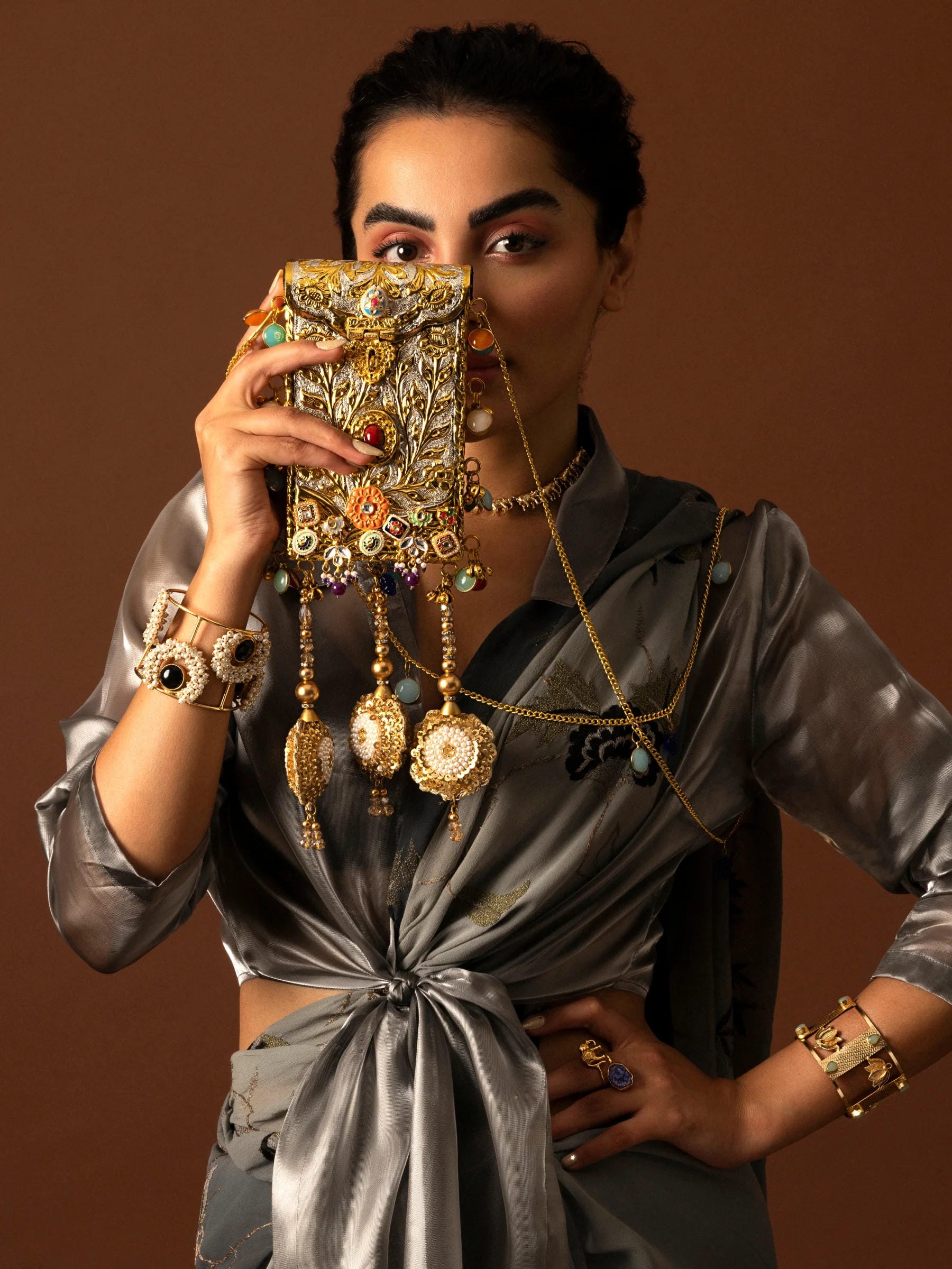 Named after zardozi, the ancient Indian art of gold-thread embroidery, the Zard Nomade Box Bag transforms textile opulence into sculpted metal elegance. Each face is hand-engraved with intricate motifs reminiscent of royal carpets and Mughal brocade borders. Jewel clusters punctuate the surface like tiny embroidered knots, glimmering with quiet extravagance. Dangling from the edges, hand-blown multicoloured glass beads add movement, texture, and a whisper of whimsy. A true ode to the free-spirited sophisticate, Zard Nomade celebrates luxury that feels lived-in, layered, and gloriously boho-beautiful.